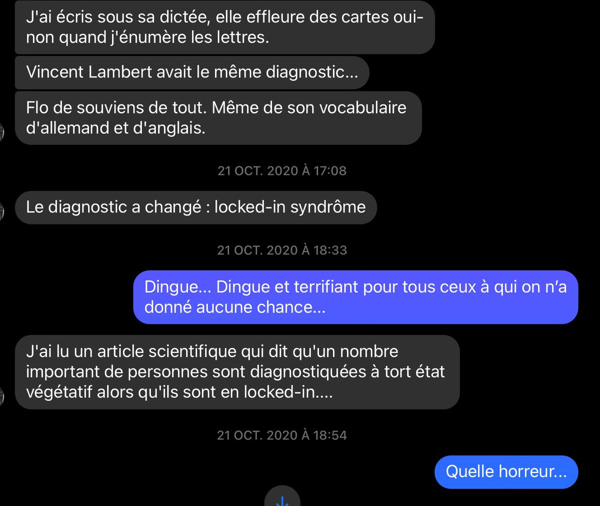 « C'est l'interview du neurologue. Tu verras qu'on l'avait diagnostiquée un moment comme en état de mort cérébrale. »