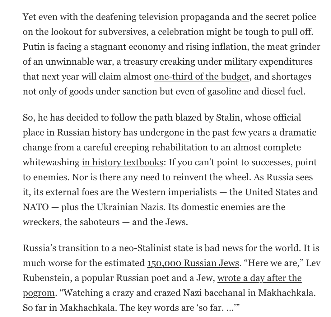 “We’re seeing rising antisemitism while Russia is going back to a new kind of Soviet Union, and step by step the Iron Curtain is coming down again. This is why I believe the best option for Russian Jews is to leave” jta.org/2023/01/03/glo…