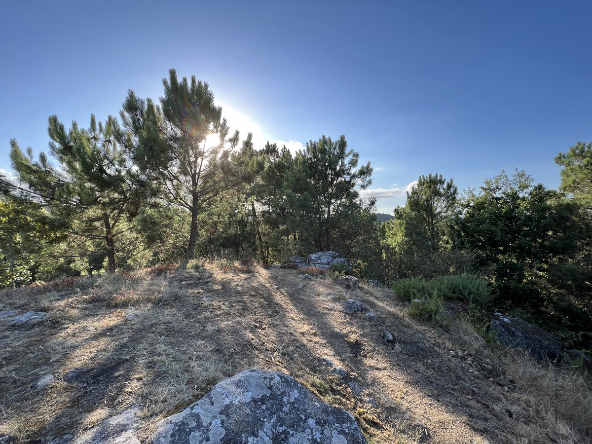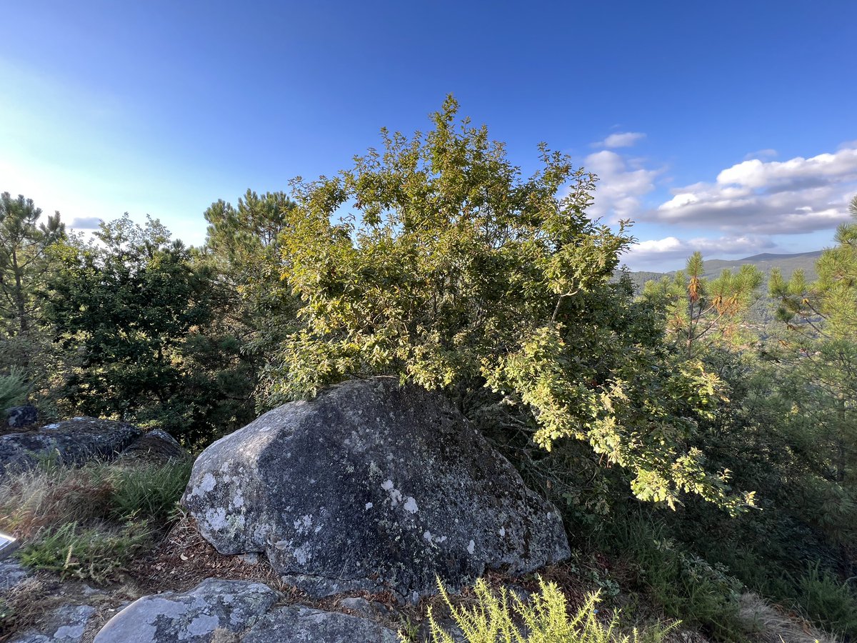 Un carballo e uns piñeiros impiden que a luz incida sobre o petróglifo.