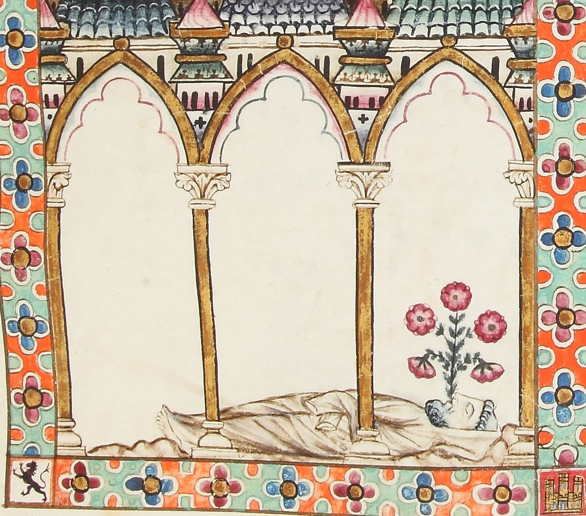 Hoxe vin no Códice Rico da Biblioteca Real esta miniatura correspondente á cantiga 56: "Esta é como Santa María fez nacer as cinco rósas na boca do monge depós sa mórte, polos cinco salmos que dizía a honrra das cinco lêteras que há no séu nome". cantigasdesantamaria.com/csm/56