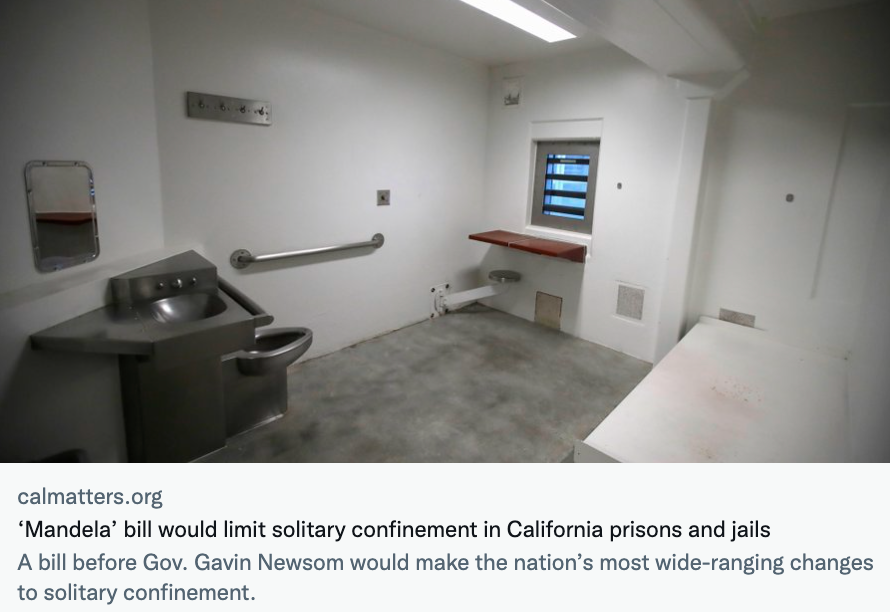 Hard to overstate how problematic this reporting is. A California publication slams modest legislation that will simply ensure CA is in human rights compliance w/ the *rest of the world.* Limit solitary confinement. But one guy says it's a bad idea. So they go w/ that. A thread: