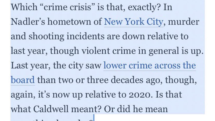 The piece starts out w/ an anecdote of a Fox reporter approaching NY Rep. Jerry Nadler. The reporter’s brother was tragically shot & killed in June. Asked about the “crime crisis.” Nadler did not immediately respond. Fox made a stink. WaPo rightfully suggests it’s complicated