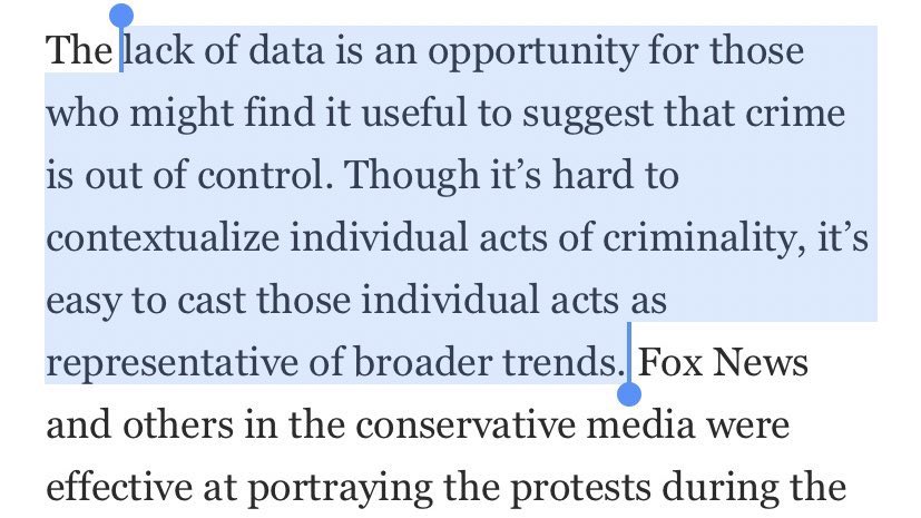 Important to note that reporter doesn’t deny crime has seen increases cross country, while acknowledging by how much & relative to what is largely unknown. What he’s looking at is the outsized disproportionate focus on it. And notable lack of attention on failures of policing.