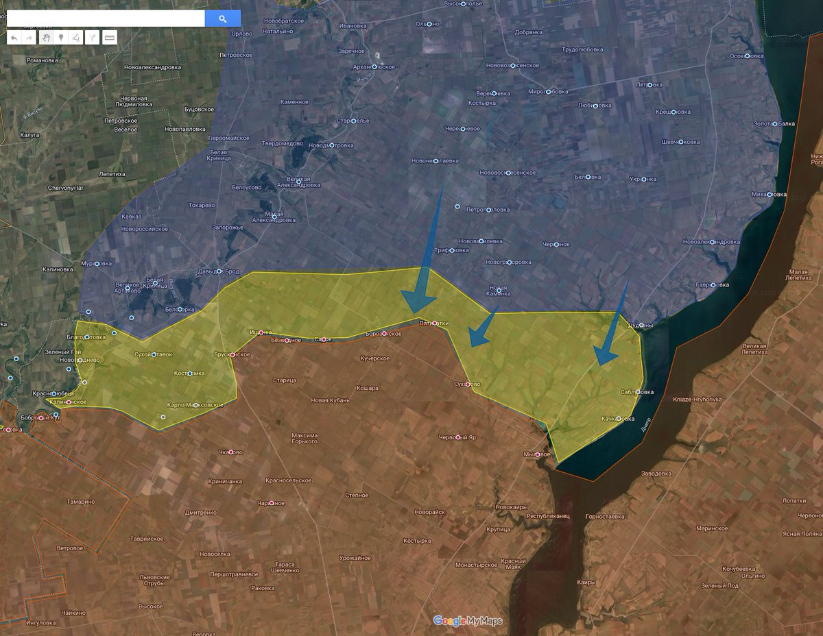 По НЕподтвержденным данным рос каналов ВСУ продвигаются в направлении Орлянское (8 км к востоку от Петропавловки) через «серую зону» между Петропавловка и Ольшана.