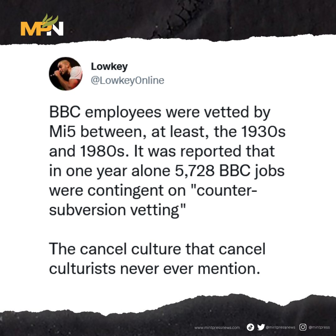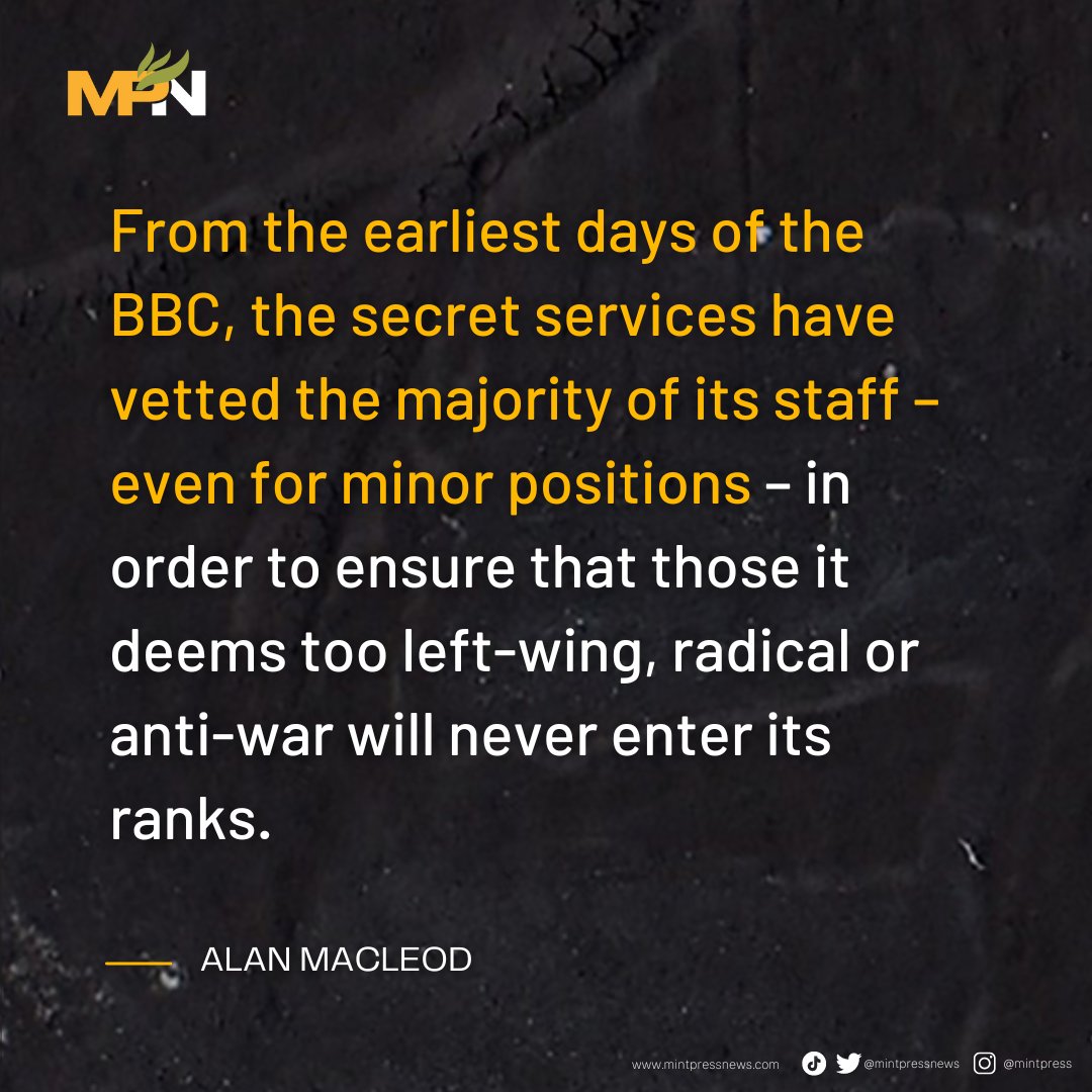 "...from the earliest days of the BBC, the secret services have vetted the majority of its staff – even for minor positions – in order to ensure that those it deems too left-wing, radical or anti-war will never enter its ranks."