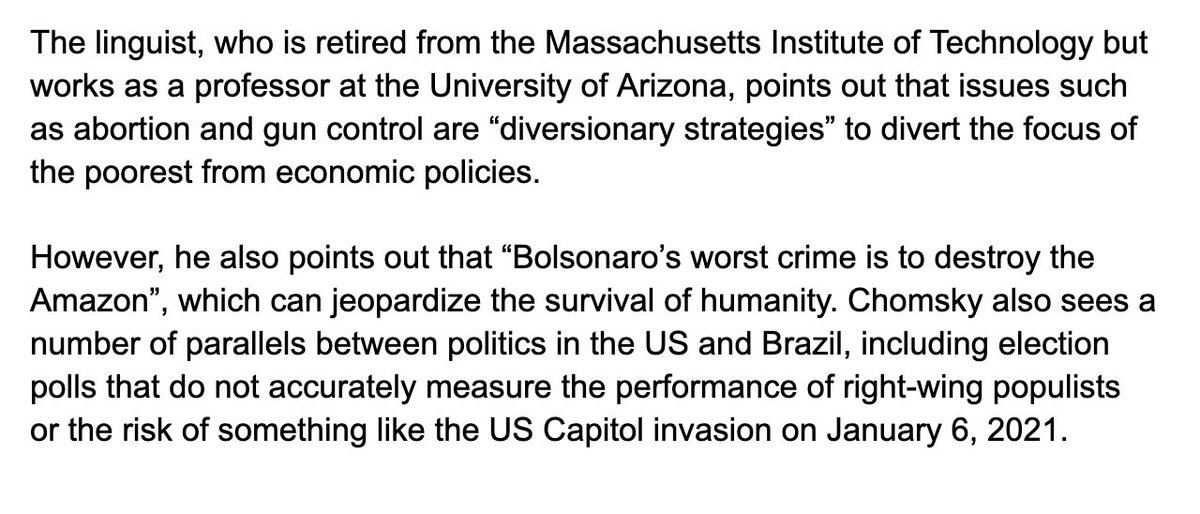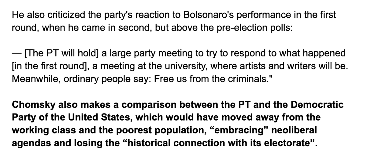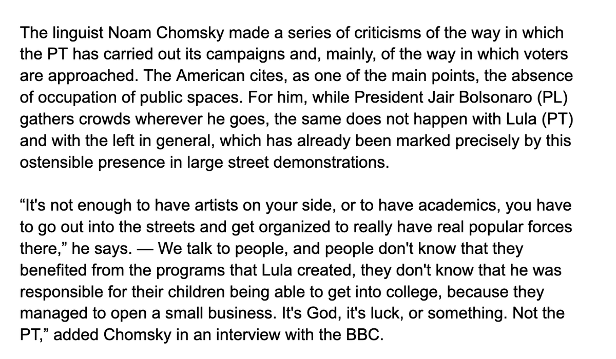 Noam Chomsky spoke to BBC and strongly criticized Lula's party, PT, for relying too much on celebrities and academics and not enough on popular movements, noting Bolsonaro has large public rallies. He also compared PT to the US Dem Party's neoliberalism: