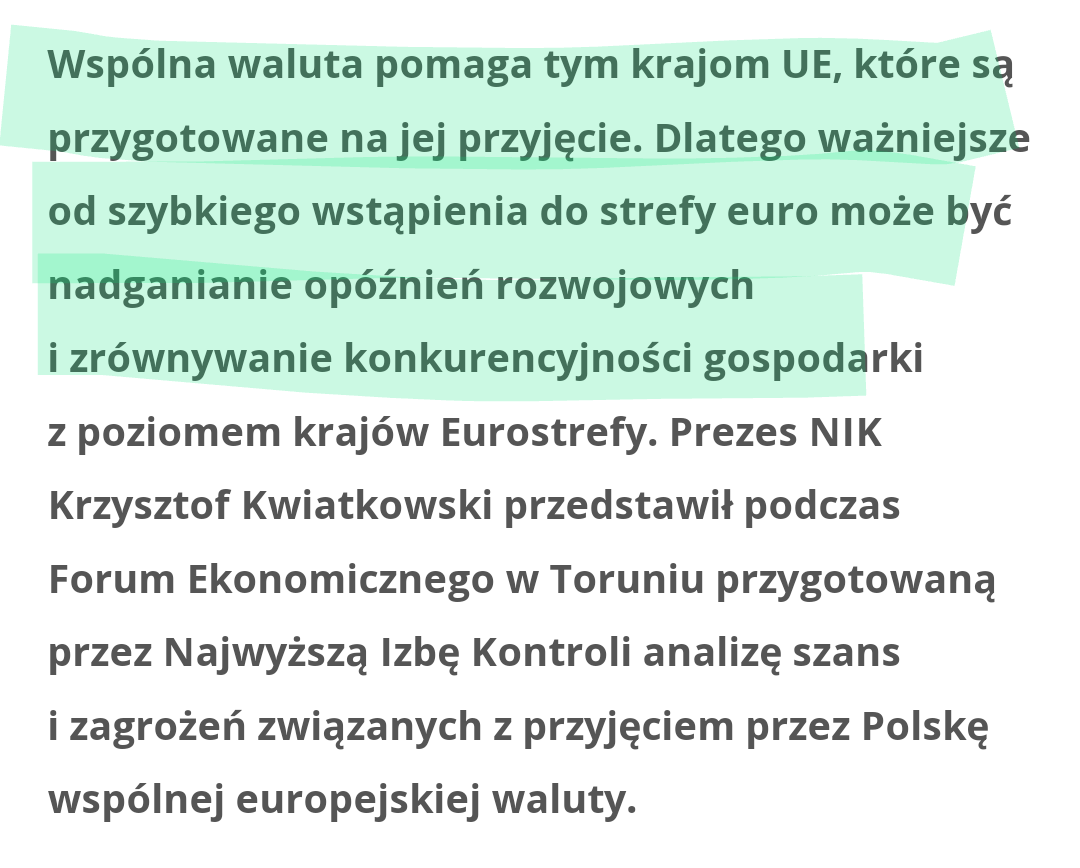 Na dziś wejście do strefy € to loteria. Nie odrzucając samego pomysłu, warto - jak sugerują MFW, NIK i niezależne analizy - wpierw wzmocnić fundamenty gospodarki, zwł. produktywność i konkurencyjność. Dać sobie czas na przygotowanie, a Eurozonie na nabranie konkretnego kształtu.