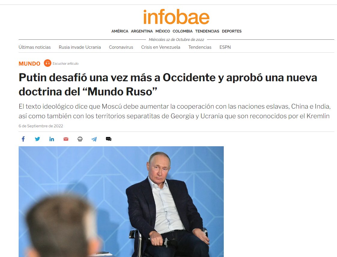 Aquí Putin fue mas explicito. El 5 de septiembre presentó su nueva doctrina exterior en la que se arroga el derecho de defensa de cualquier comunidad eslava que habite fuera de Rusia. Es un problema, porque el imperio soviético colonizó con rusos a todas los países de su esfera