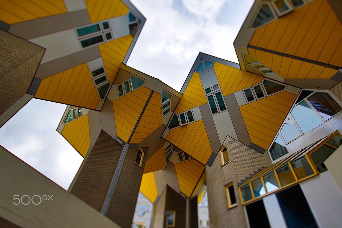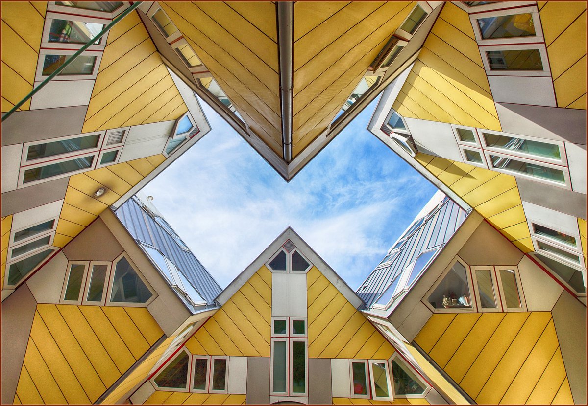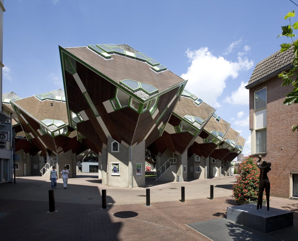 Las casas cubo están insólitamente giradas a cuarenta y cinco grados respecto al eje vertical.