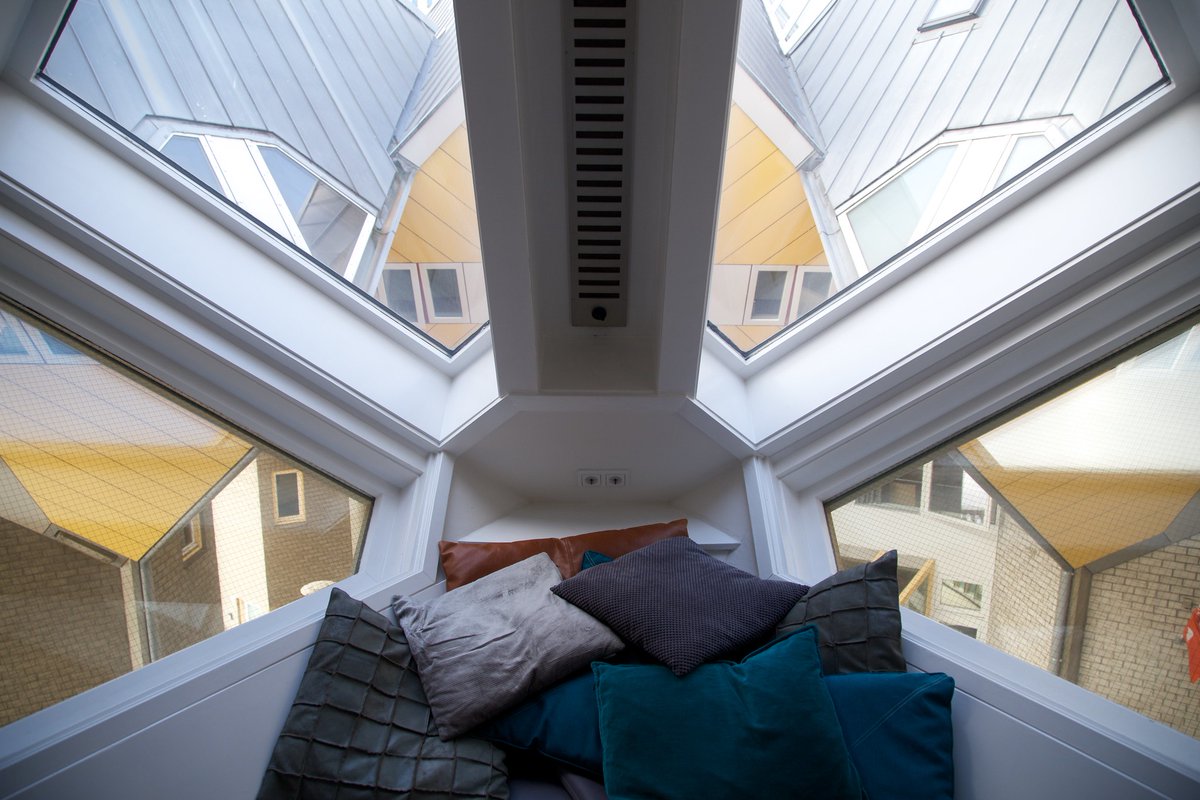 Ese vivir entre las copas de los árboles, en un tejado urbano, fue la idea generadora del proyecto de las Kubuswoningen, las Casas Cubo y, en efecto, en las casas cubo se vive lejos del suelo.