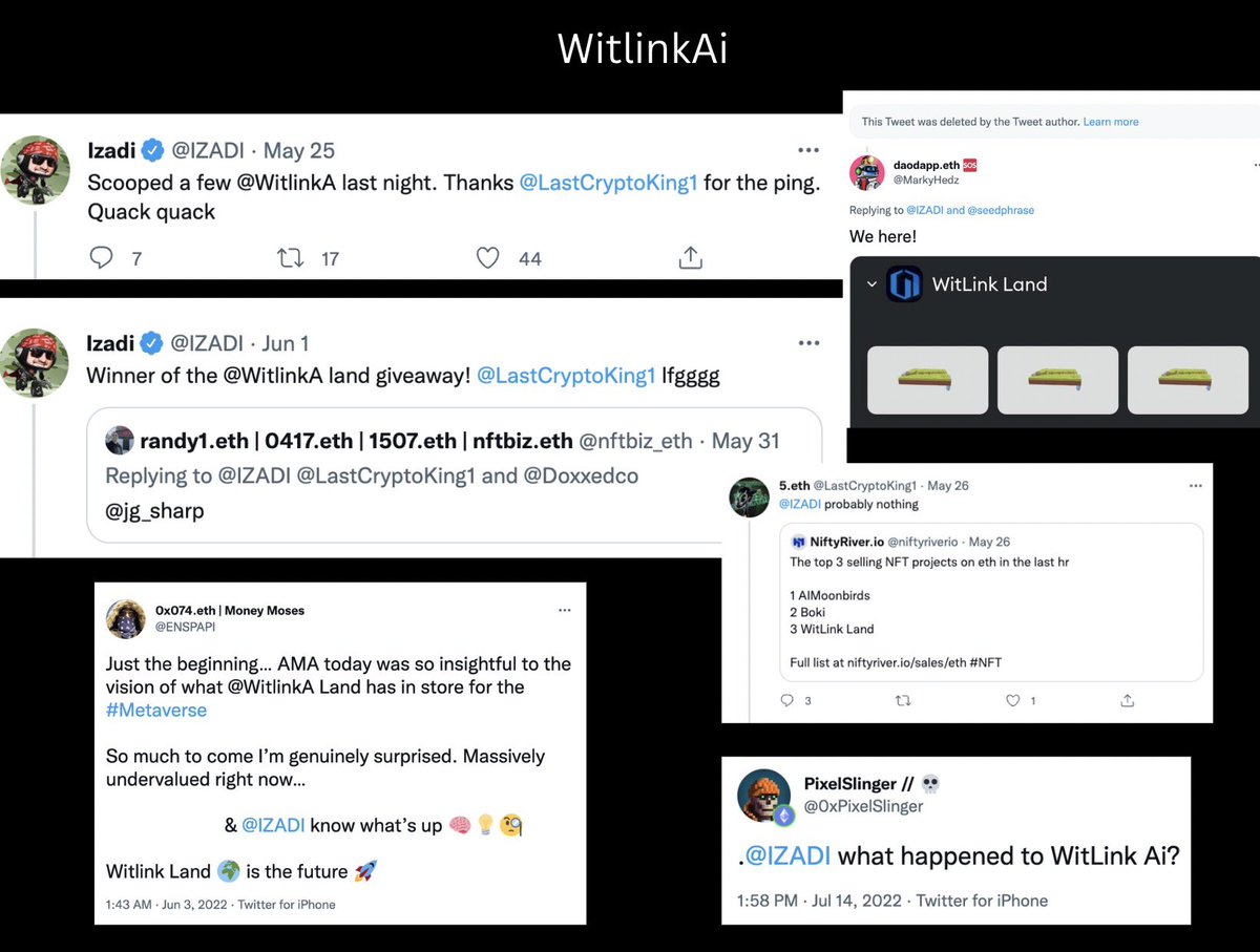 May 2022: Izadi shilled Witlink, held spaces for them, pumped his group chats, ran giveaways and posted many tweets on WitlinkAI that have since been deleted. WitlinkAI is a confirmed rug.