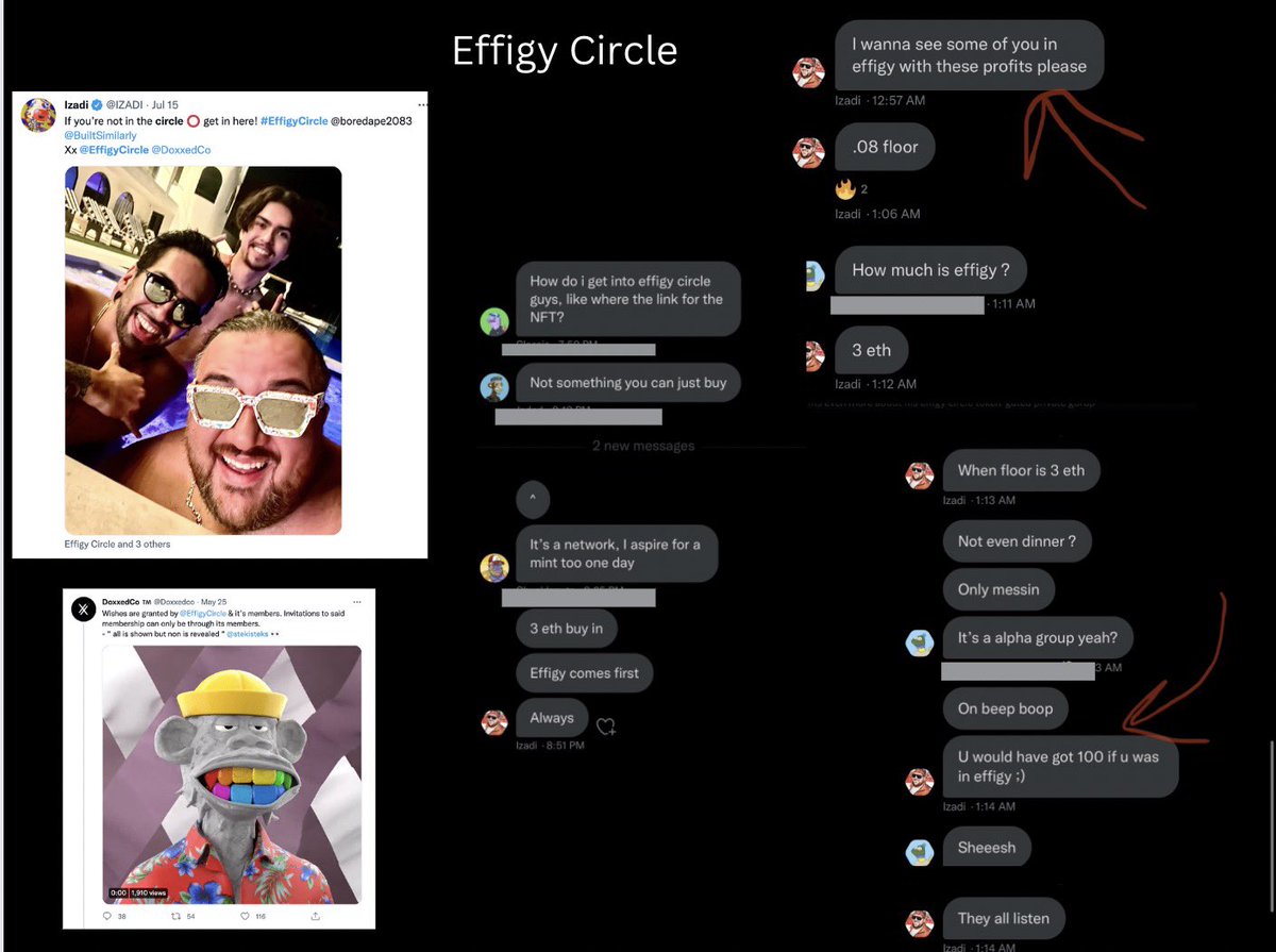 May 2022: Izadi went live with an “exclusive” group @effigycircle. 3 eth entry. Izadi & co find dead projects use them as personal “pump & dump” passes. They manipulate mints and floor prices.