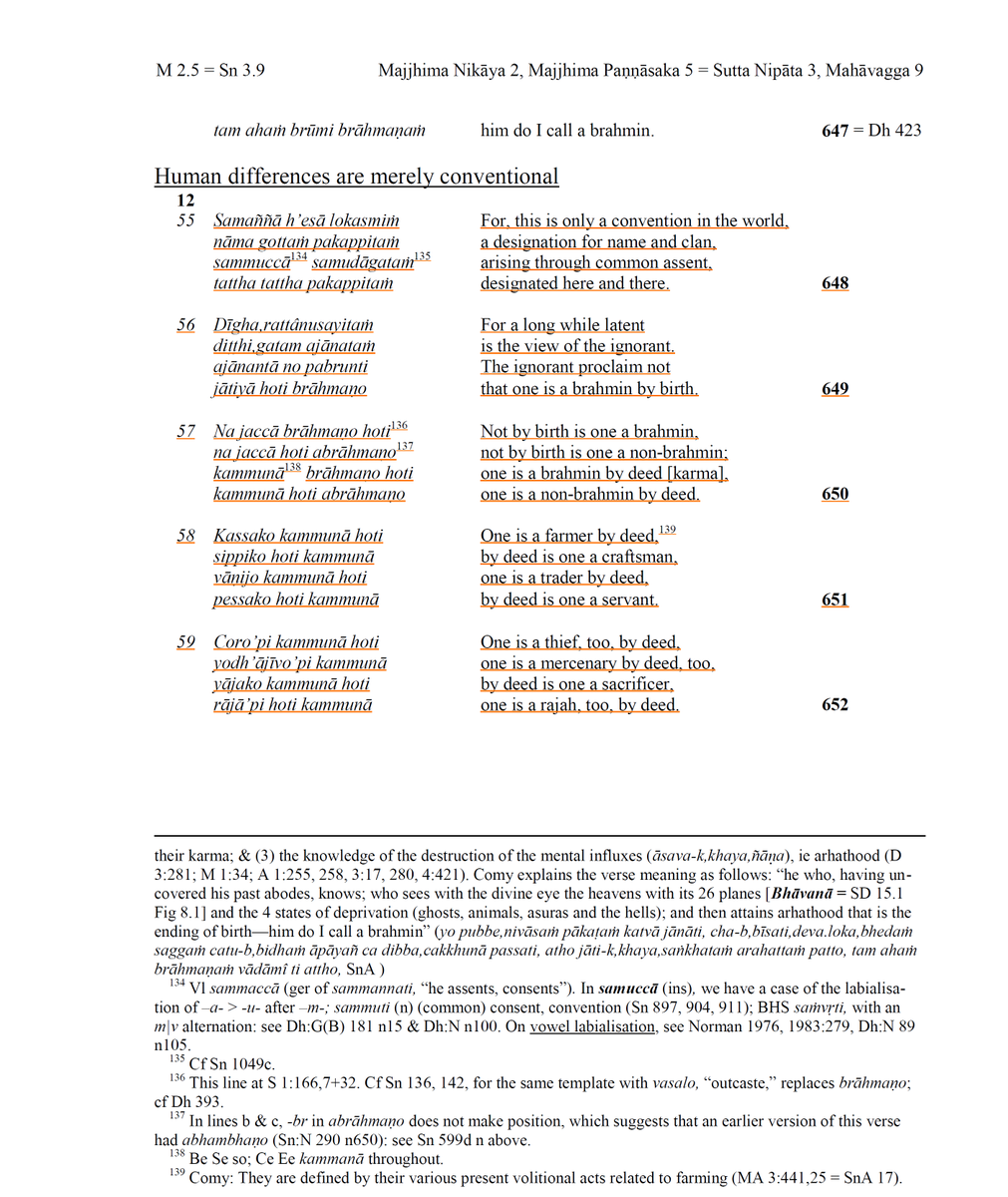 23/n In Sutta 650-52, he identifies the varnas by profession (karmana). In Sutta 657-659, too Buddha explains Karmana to be equivalent to profession of livelihood than the "deeds".