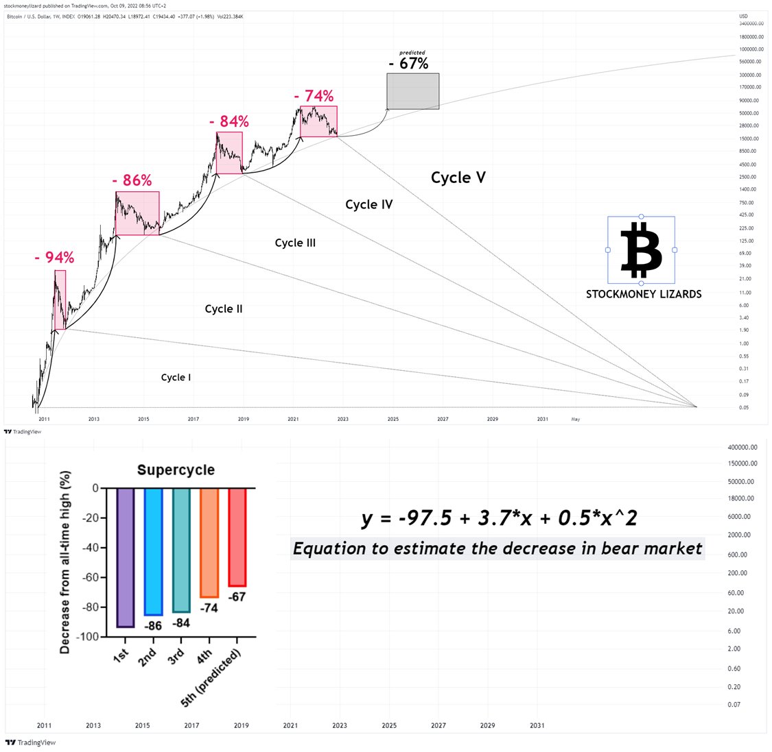 The other question is how low can the #Bitcoin price go. Has the bottom currently been reached? Indeed, we saw a consecutive lower decline after all-time high between cycles. The larger the market cap, the smaller the drop☔️