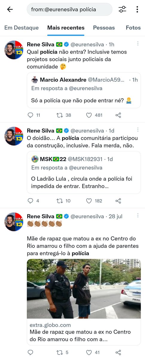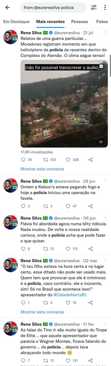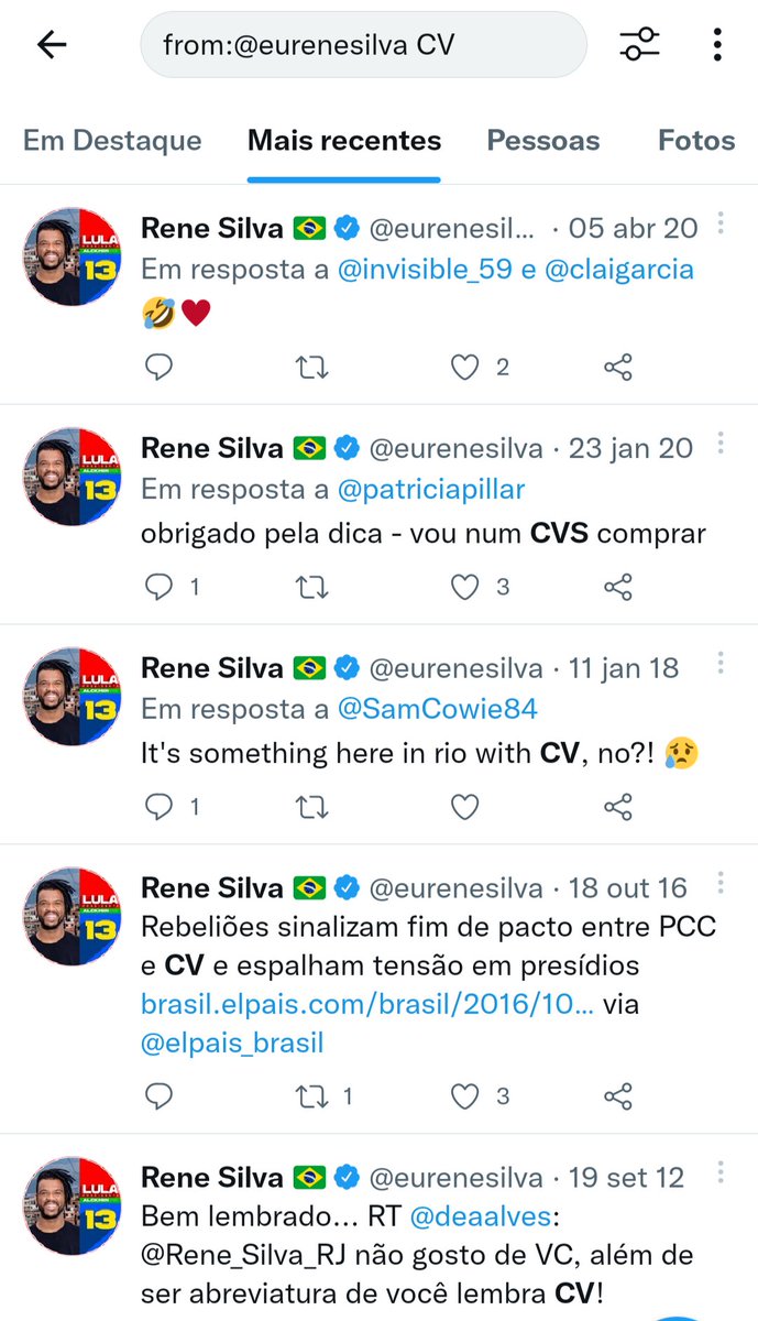 Na sua página do twitter digitei duas pesquisas uma sobre Comando Vermelho ou CV (Facção q domina a comunidade) e a palavra polícia e vejam a diferença.⬇️