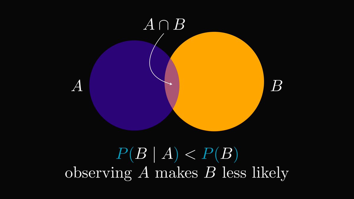 On the other hand, a low P(B | A) makes B less likely to happen when A occurs as well.