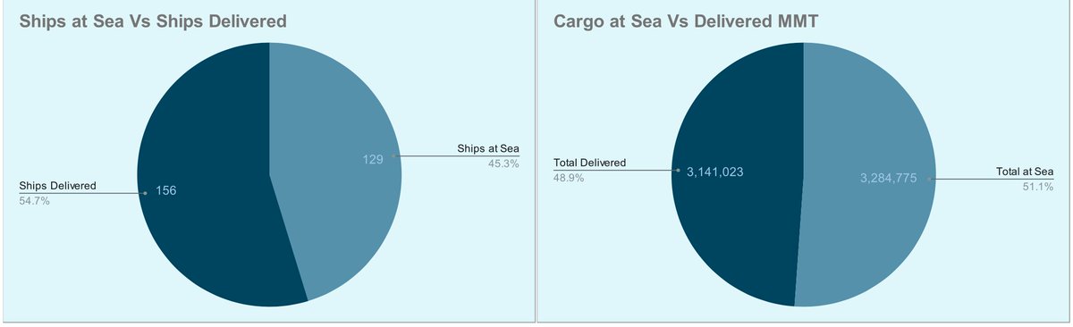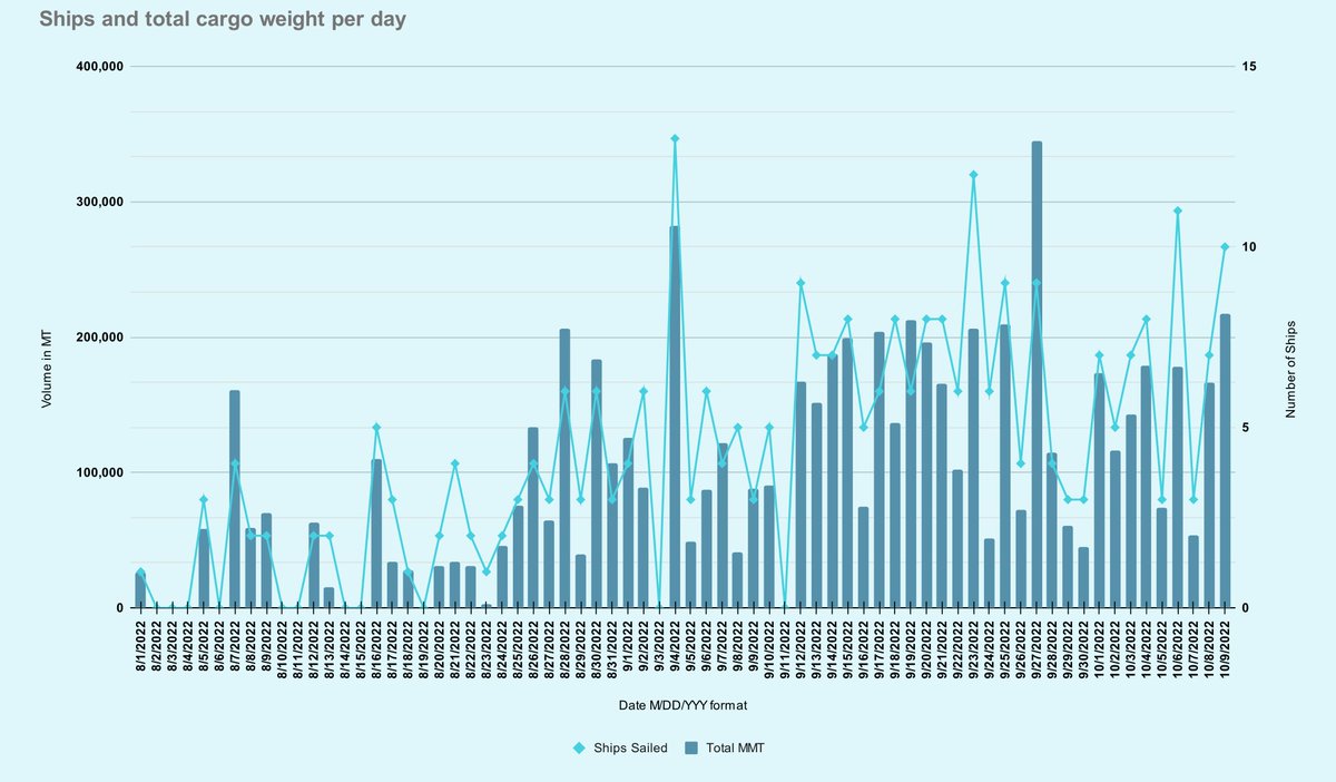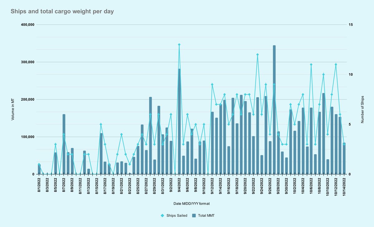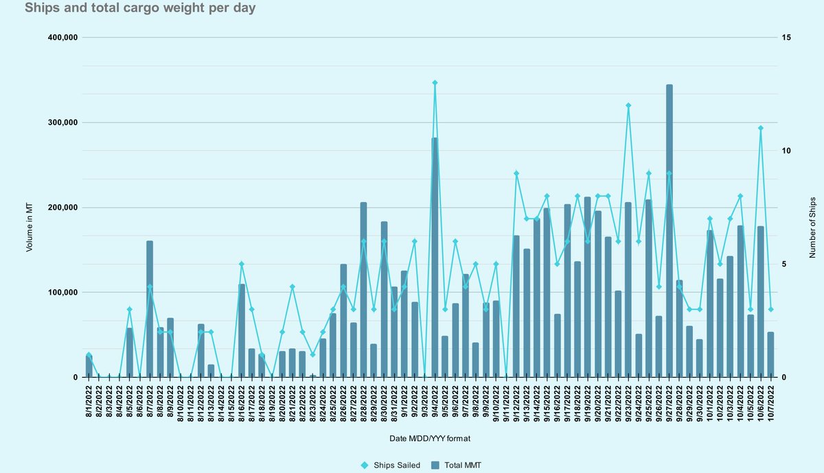 44 days left in the grain deal, 285 ships outbound, 156 delivered, 6,425,798 MT shipped and 3,141,023 MT delivered. Another @WFP ship is underway!🧵⬇️ #oatt#wheat#corn#barley#sunflowers