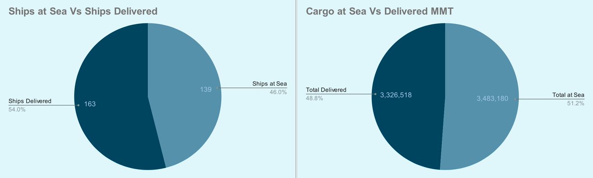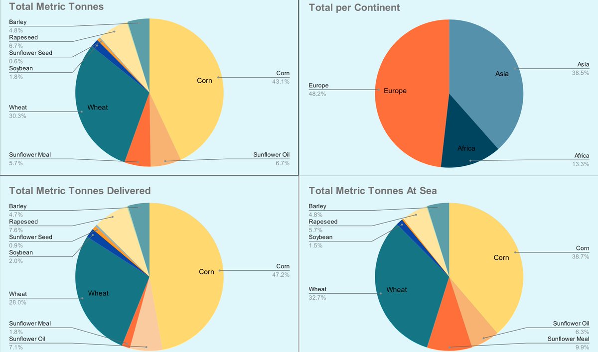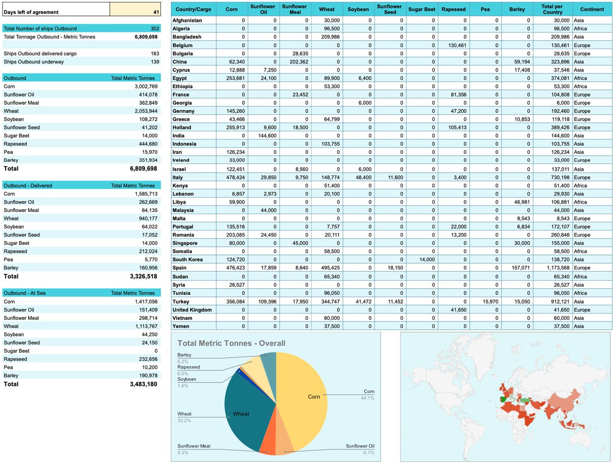 41 days left in the grain deal, 302 ships outbound, 163 delivered, 6,809,698 MT shipped and 3,326,518 MT delivered. Approaching 7MMT exported through the grain deal. 🧵⬇️ #oatt#wheat#corn#barley#sunflowers