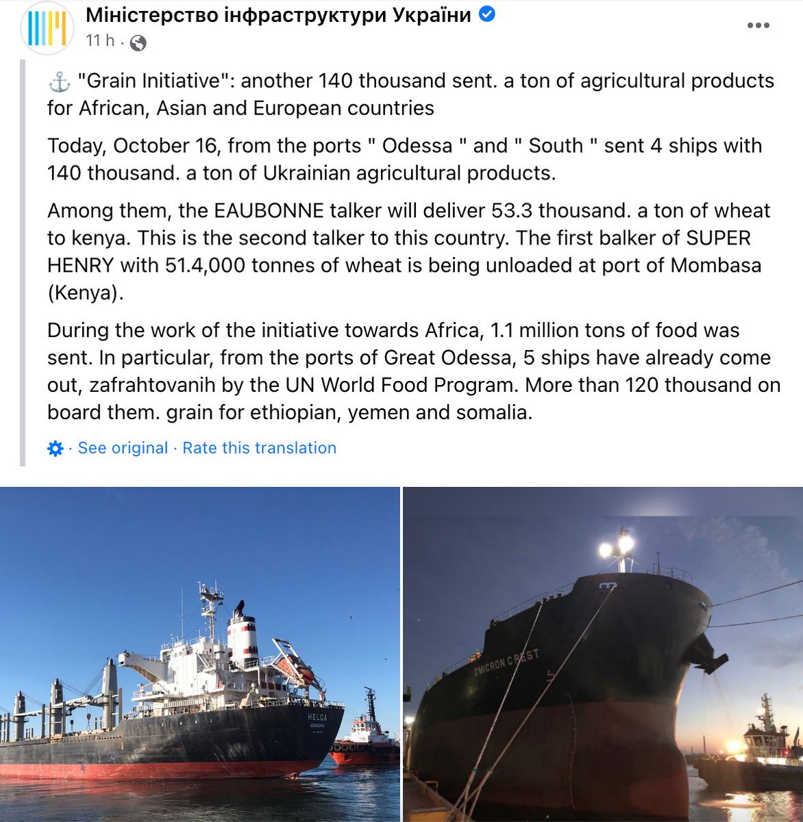 39 different countries have directly imported Ukrainian grain and two of today's ships were headed to Africa with wheat.