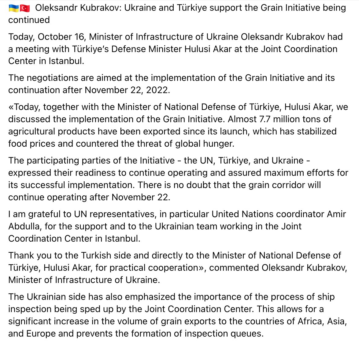 In the midst of all this, meetings regarding the grain deal were held in Istanbul at the JCC today between Ukraine and Turkey who both touted their desire to keep moving forward.