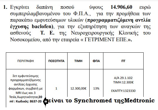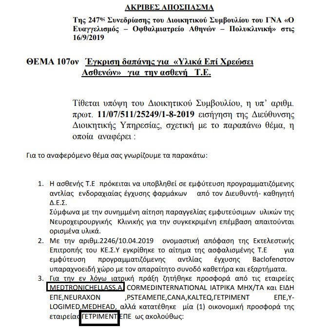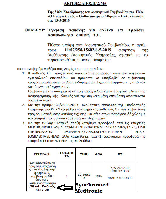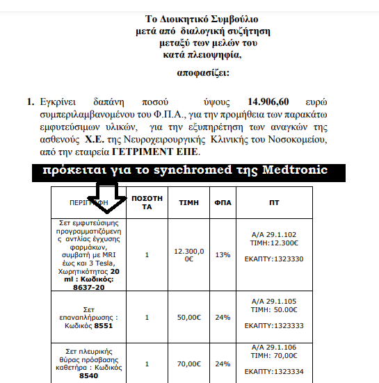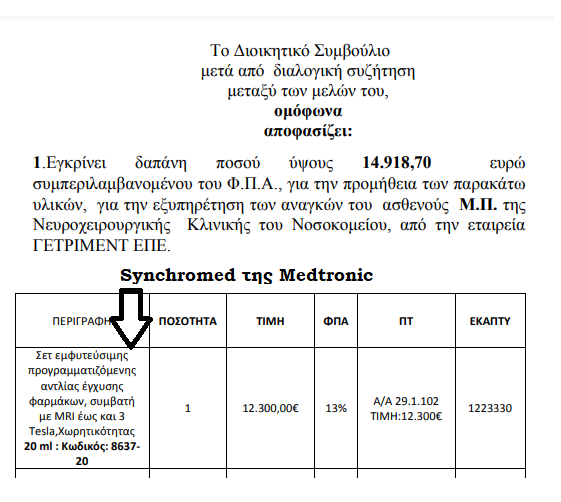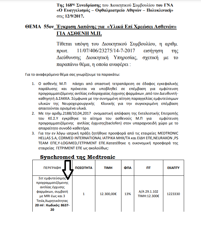 Ο καθηγητής-διευθυντής της Νευροχειρουργικής κλινικής ζητάει προσφορές για αντλία έγχυσης BACLOFEN* & από τη Medtronic. Καταθέτει μόνο η εταιρεία ΓΕΤΡΙΜΕΝΤ. Πουλάει το Synchromed! Δε θα το μάθαινε ποτέ κανείς;