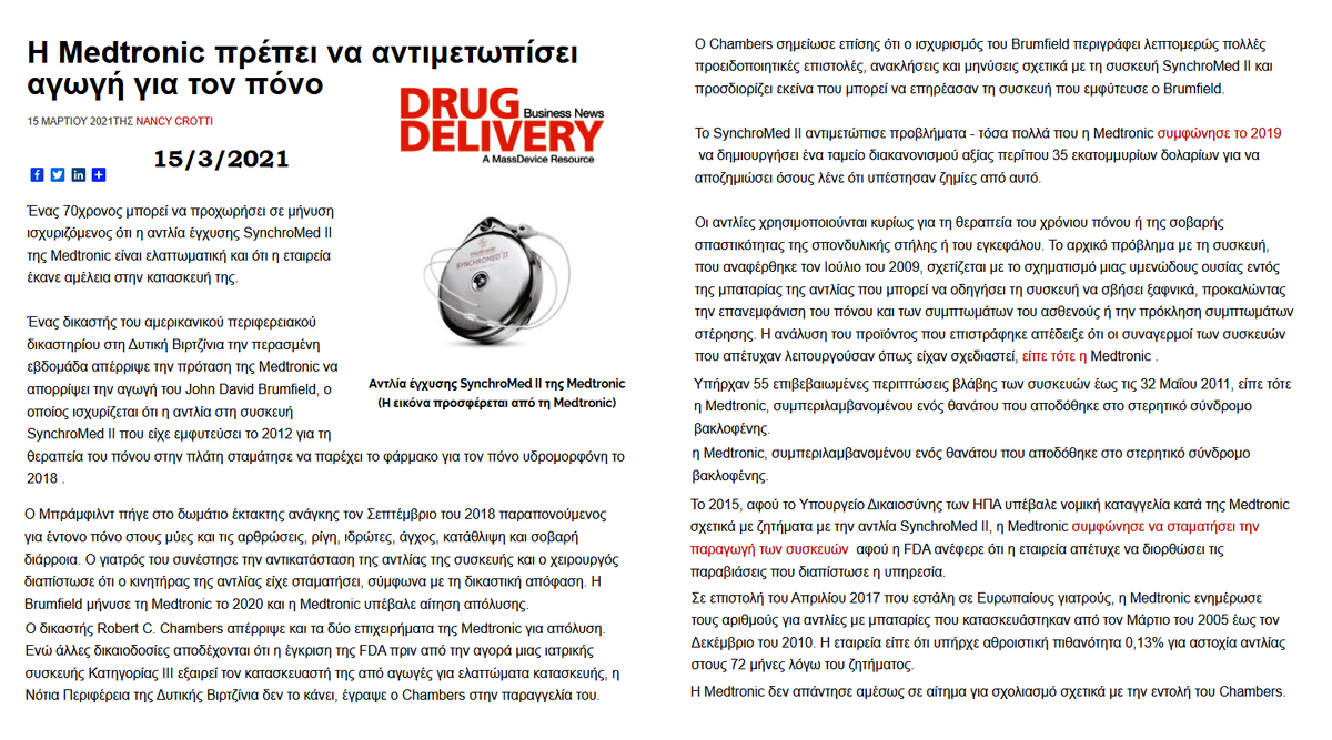 Το 2008 η κατασκευάστρια του Synchromed είχε αναφορές για σχηματισμούς φλεγμονώδους μάζας στο άκρο των καθετήρων που εγχέουν οπιοειδή, βακλοφένη ή φάρμακα χημειοθεραπείας σε ασθενείς. Στις ΗΠΑ δικηγορικές φίρμες τους ενημέρωναν περαιτέρω. Στην Ελλάδα δε γνώριζαν το παραμικρό.
