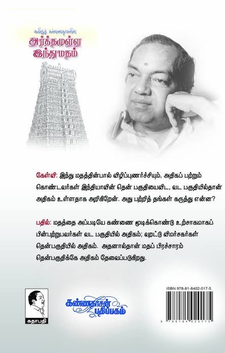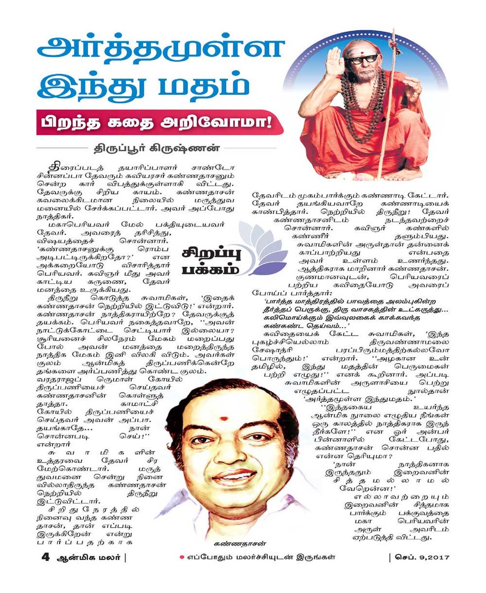 மாயமானுஷாய நமோ நமஹ, அர்த்தநாரி திருவண்ணாமலை சேஷாத்ரி மகானுக்கல்லவா இது பொருந்தும்’ என்று அருளாசிக் கூறி, ‘அங்கிங்கெனாதபடி எங்கும் நிறைந்திருக்கும் நிர்மலப் பொருள் ஞானசூரியனாம், மதத்தின் பெருமையை எழுது’ என்று திருவாய் மலர்ந்தருள, அக்கணமே கண்ணதாசனின் மனதில் “அர்த்தமுள்ள இந்துமதம்”