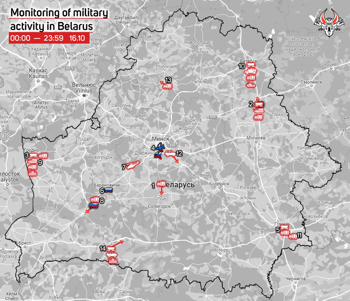 1) October 14, 22:00. 6 buses and 3 trucks of the Belarusian Armed Forces were moving from Parychy (Svetlahorsk district) towards Kalinkavichy along the R31 highway.