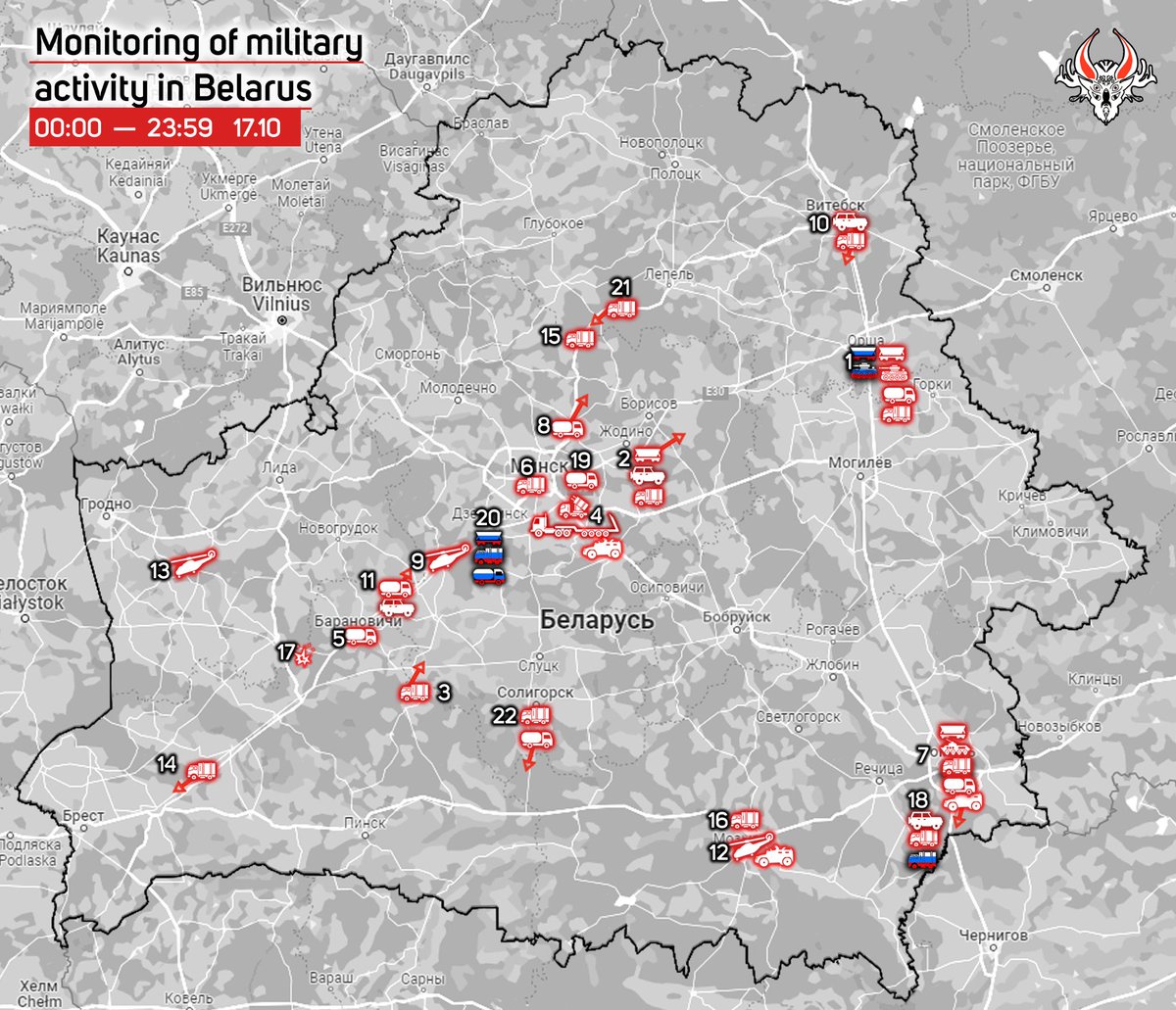 1) October 15, 11:30. A column of 6 trucks of the Belarusian Armed Forces was moving along the R23 highway towards Slutsk.