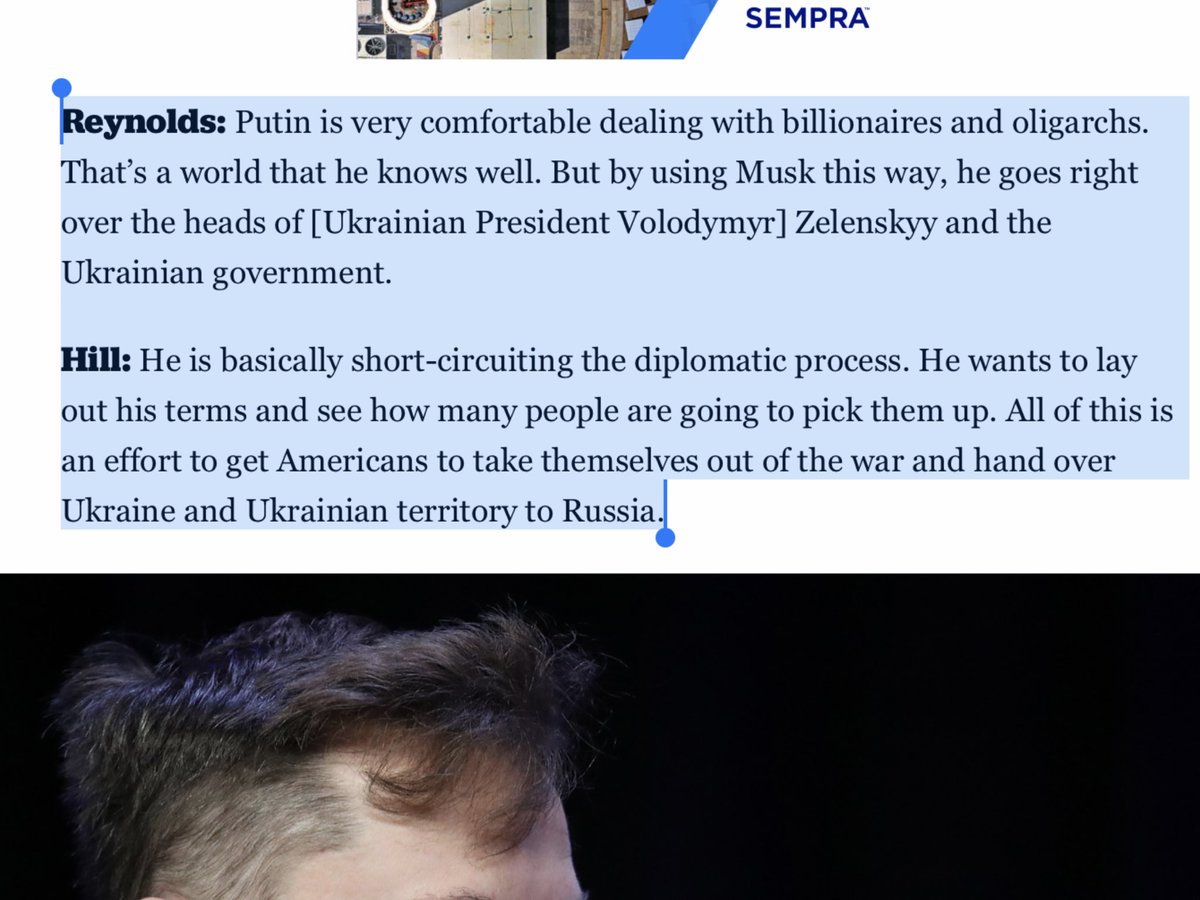 Putin, using Musk, “is basically short-circuiting the diplomatic process. He wants to lay out his terms & see how many people are going to pick them up. All of this is an effort to get Americans to take themselves out of the war” politico.com/news/magazine/…