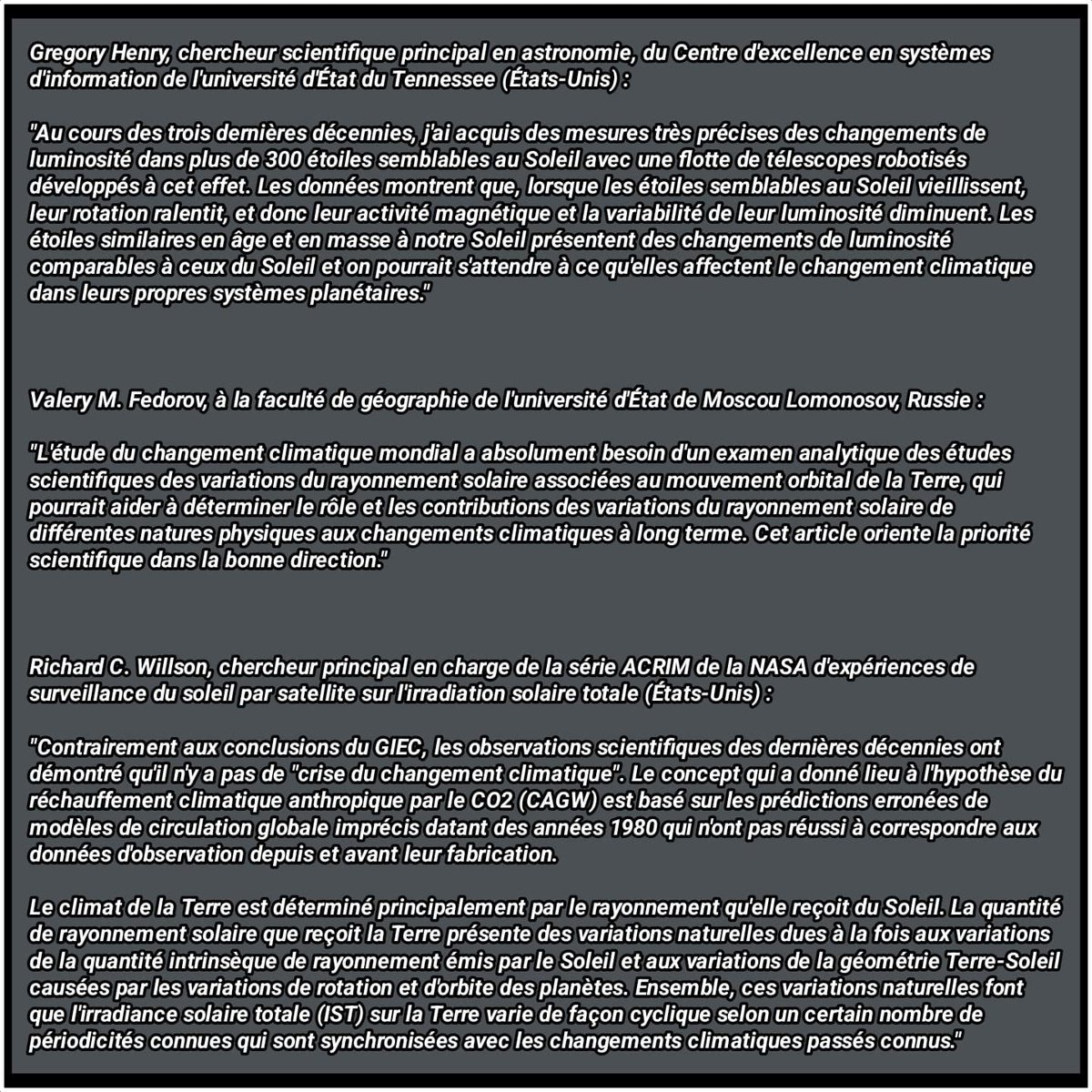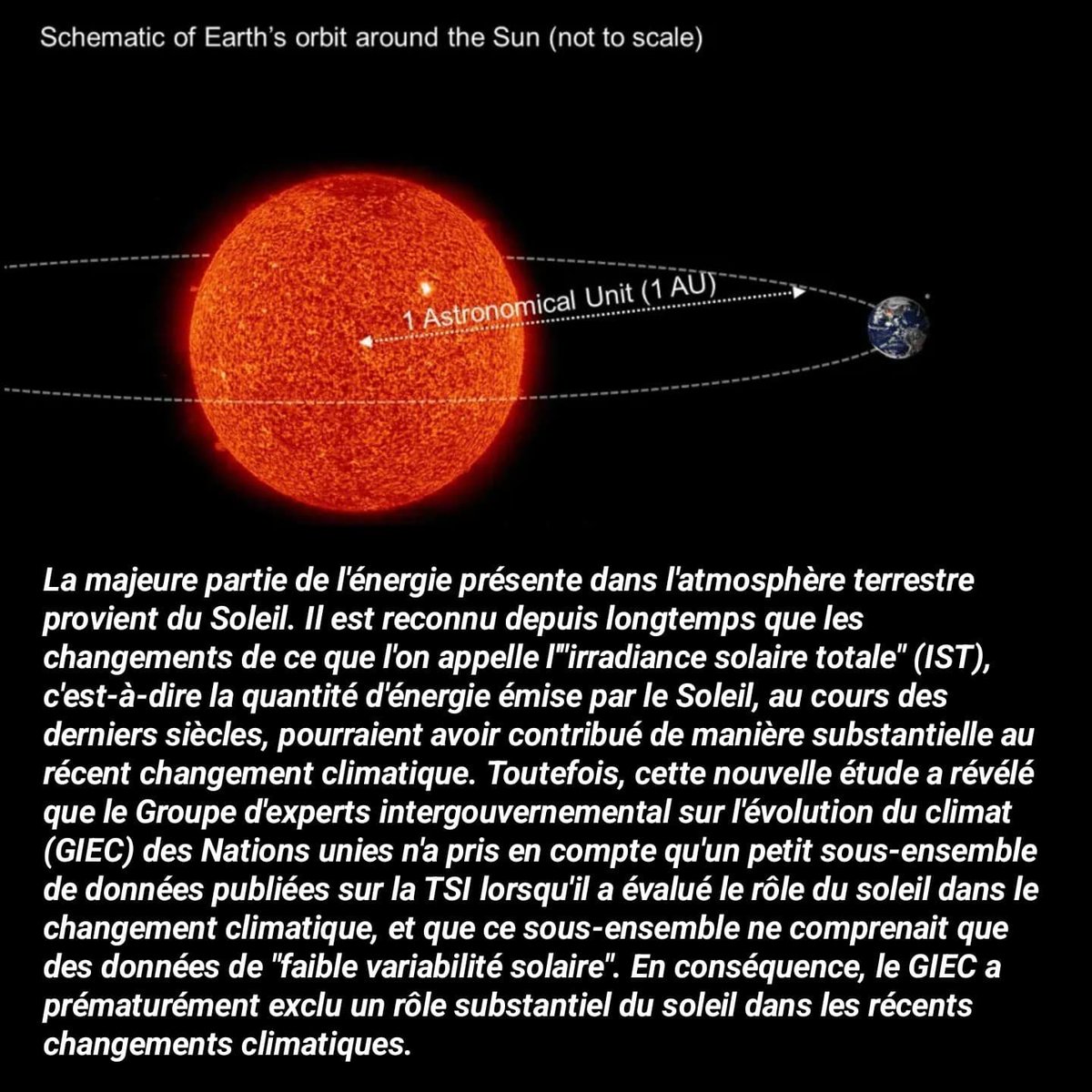 A savoir que les changements de la température mondiale depuis le milieu du XIXe siècle sont principalement dus à des cycles naturels, notamment à des changements à long terme de l'énergie émise par le soleil.