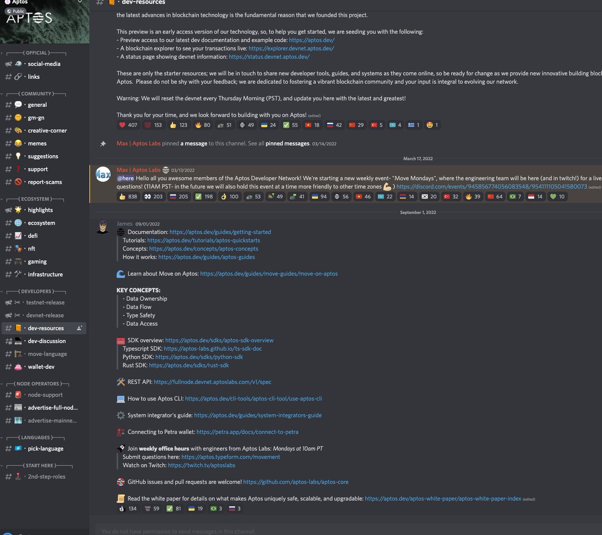 Aptos knows something is wrong. Between genesis and 1:30 PM PT, the aptos discord was disabled - users couldn't chat or ask any questions. They've only recently opened a few channels, but important channels like dev-resources are still closed.