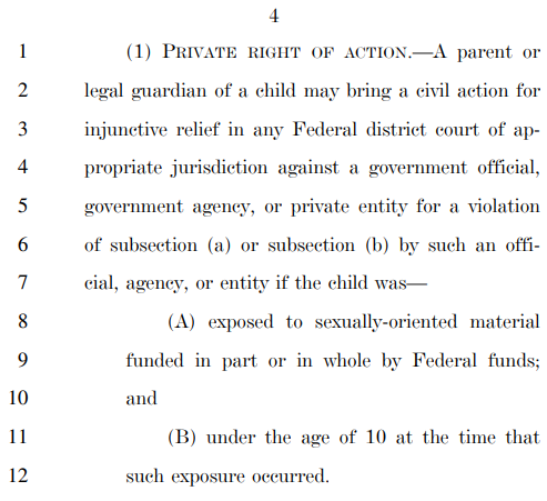 The bill uses a private right of action (bounties) here to say that if those under age 10 are exposed to sexually oriented material by any entity that receives federal funding (so, 98% of public life), the parent can sue: