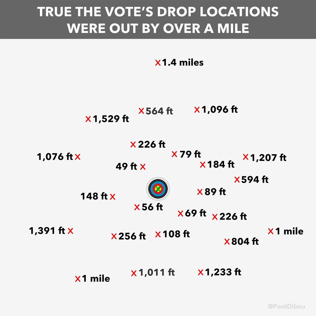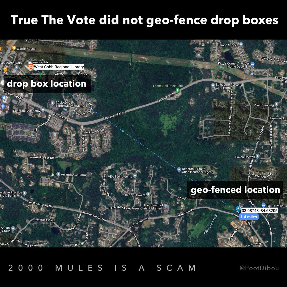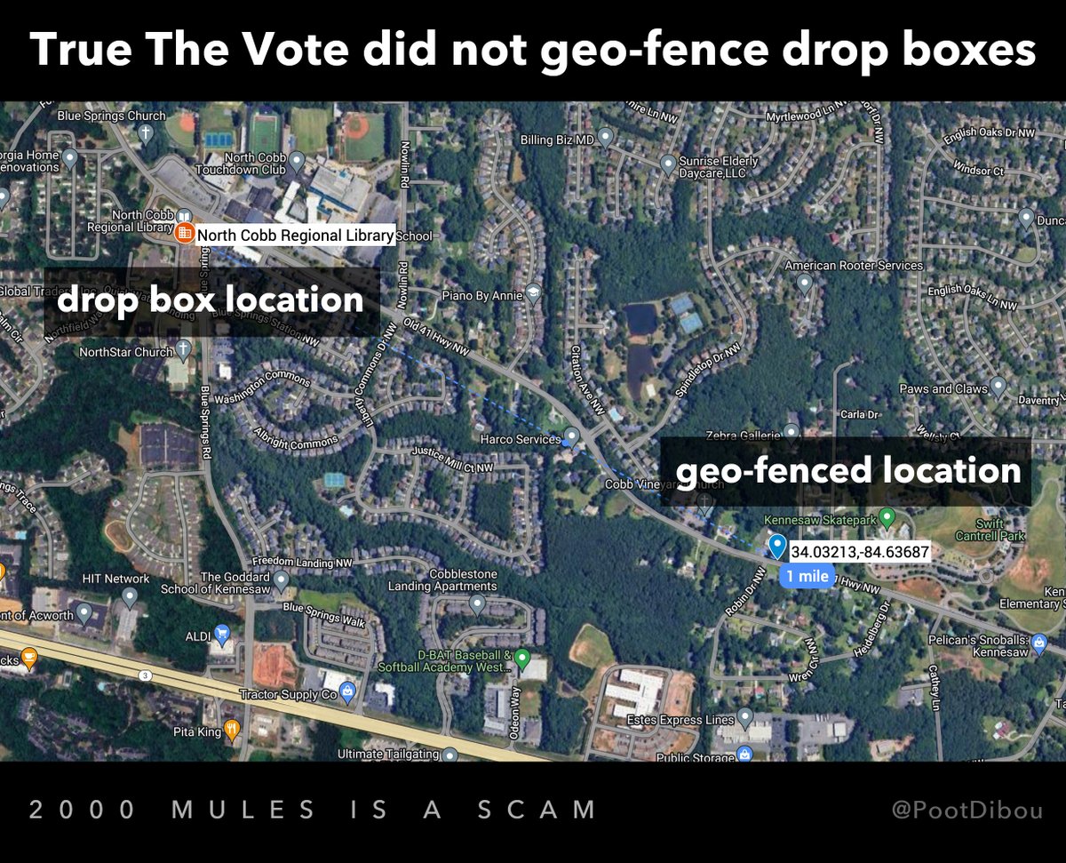 🚨 BOMBSHELL: @TrueTheVote's 2000 Mules data used is fundamentally flawed. Their alleged drop box locations were off by over a mile, meaning their geo-tracking of supposed "ballot trafficking mules" visiting drop boxes is completely invalid. 🧵