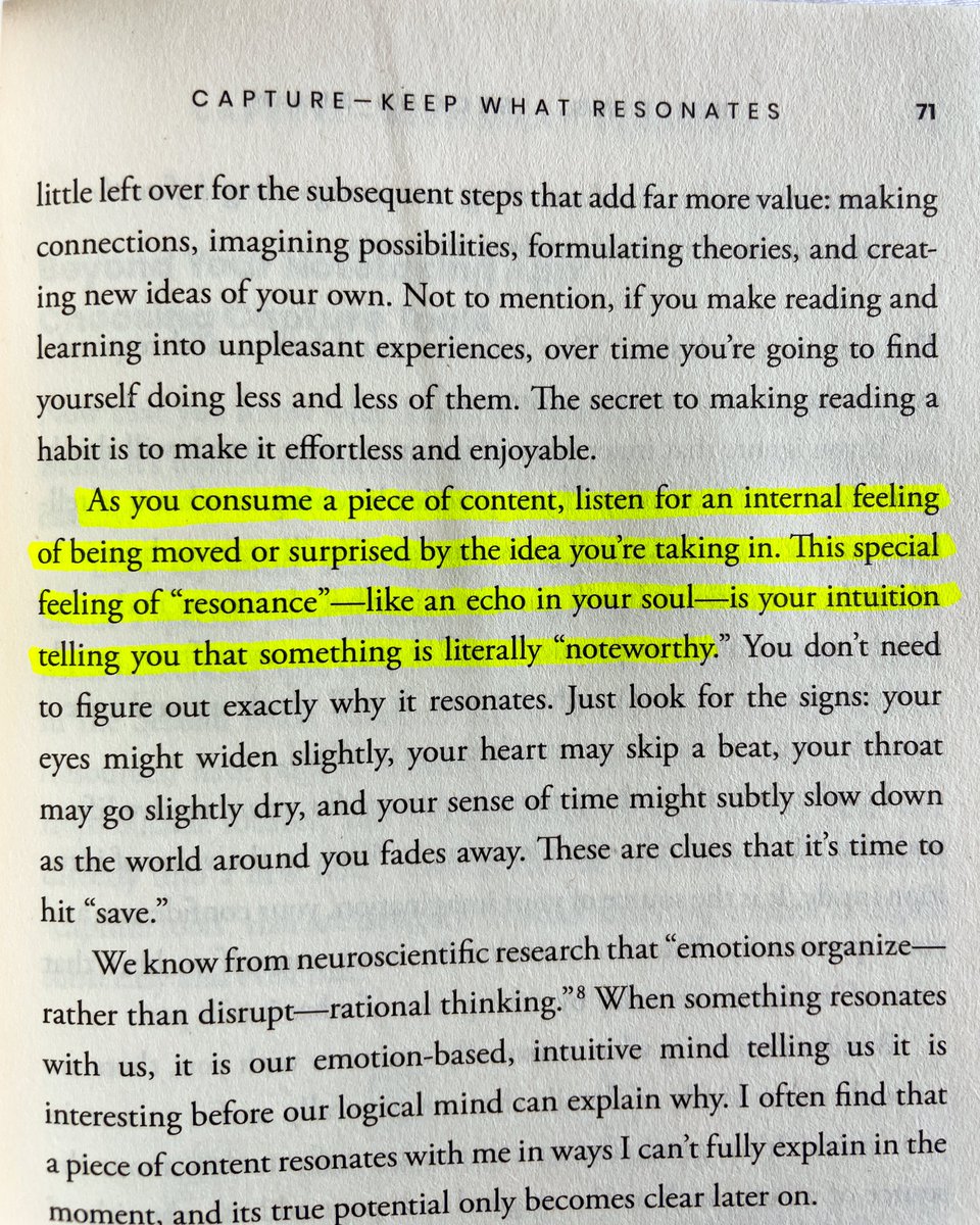 6) As you consume a piece of content, listen for an internal feeling of being moved or surprised by the idea you're taking in. This special feeling of "resonance"