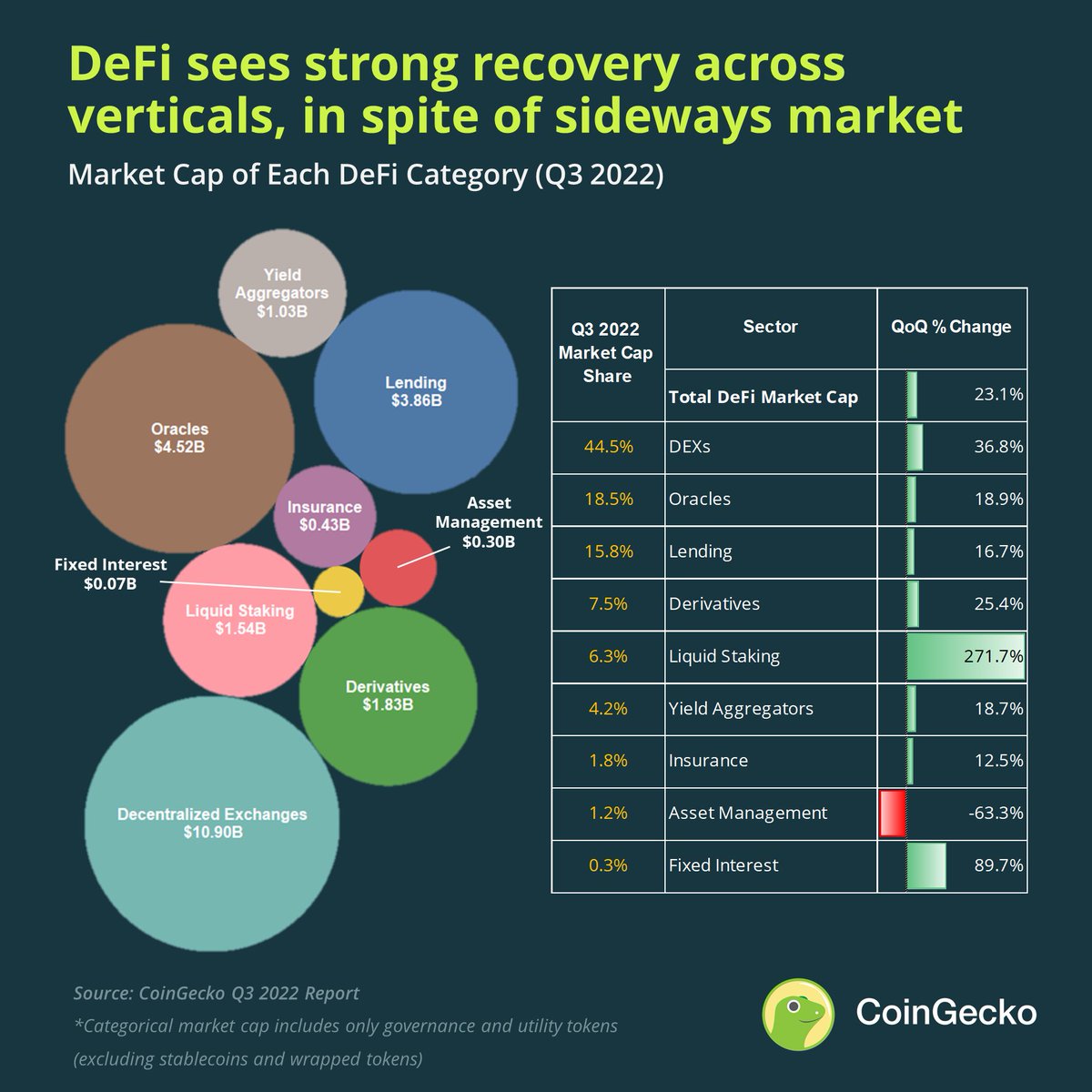 • DeFi enjoyed a decent rebound with a market cap growth of ~31% QoQ.