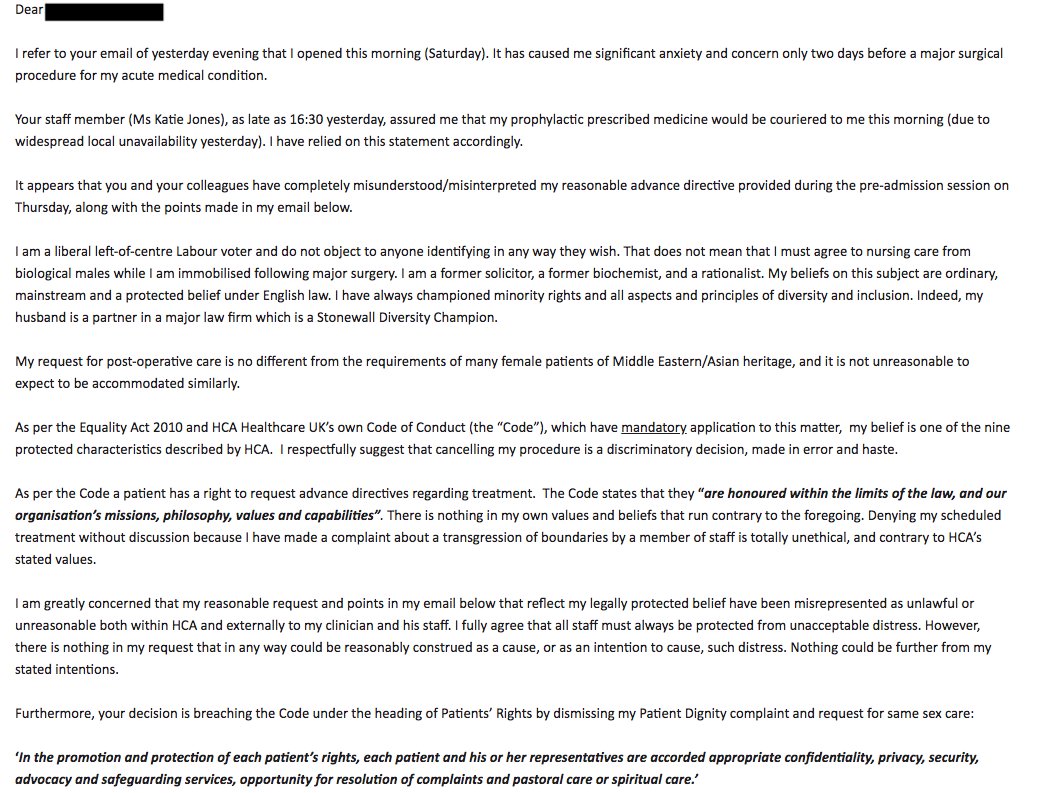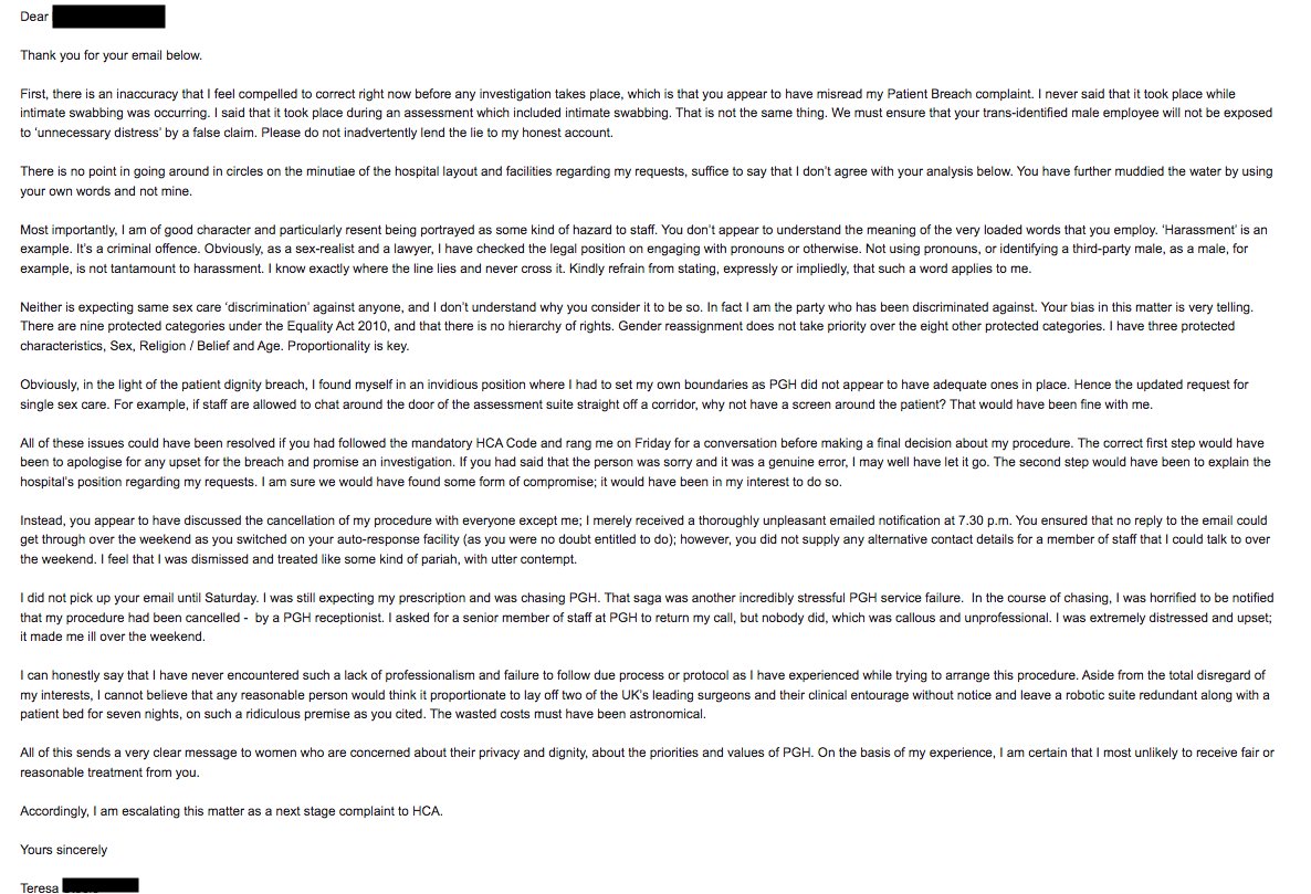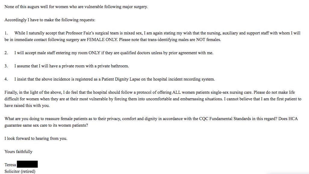 A victim of sexual assaults, Teresa made it clear to the hospital how important this issue was to her, by both requesting a single-sex room and bathroom, and stating she would only answer questions on forms about her sex, not her 'gender identity' 3/12