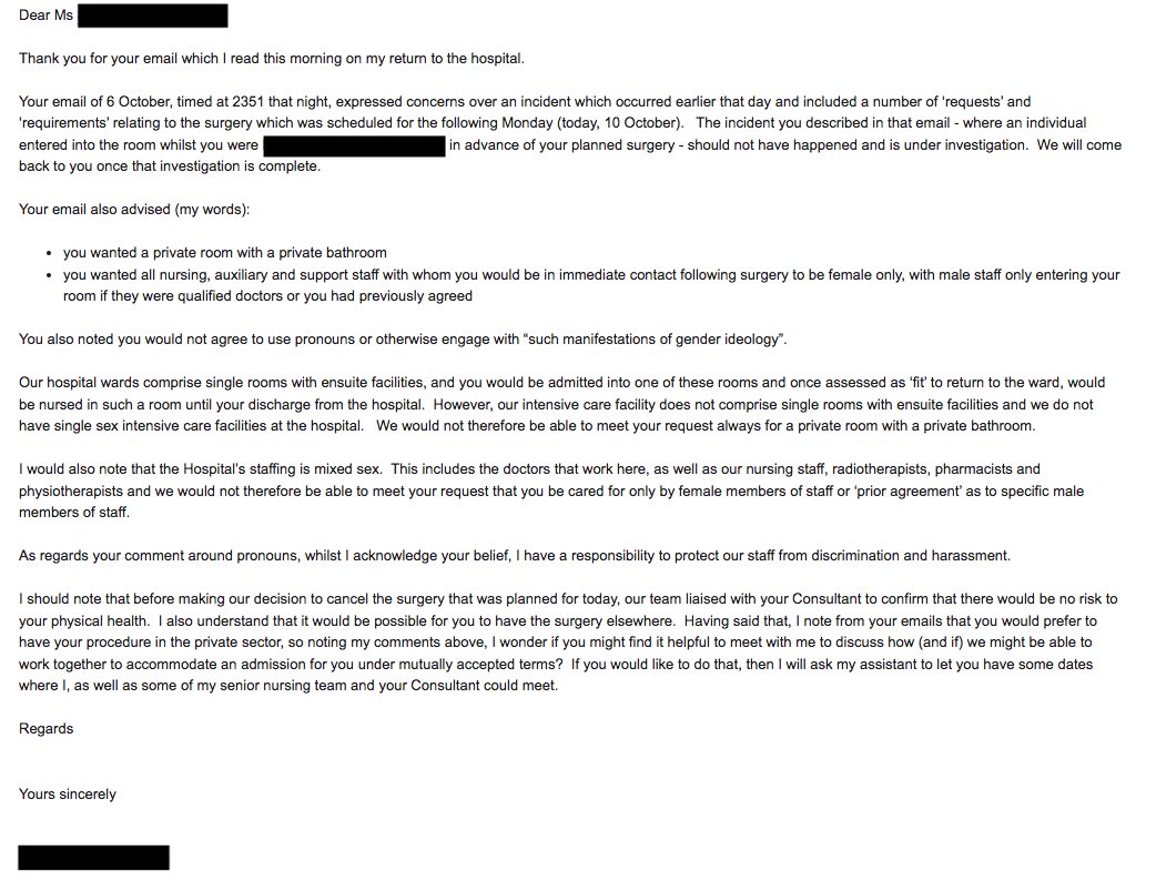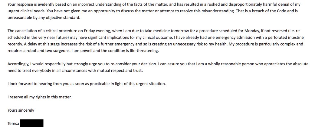 She then found an email had been sent to her by the CEO of the hospital saying the operation, which was due the next working day, had been cancelled due to a 'lack of shared values' and to 'protect staff from unacceptable distress' 7/12