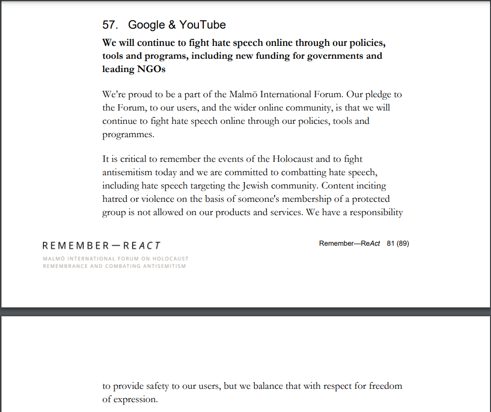 In 2021, Google pledged to “continue to fight hate speech online through our policies, tools and programs, including new funding for governments and leading NGOs” at an international event aimed at fighting anti-Semitism.
