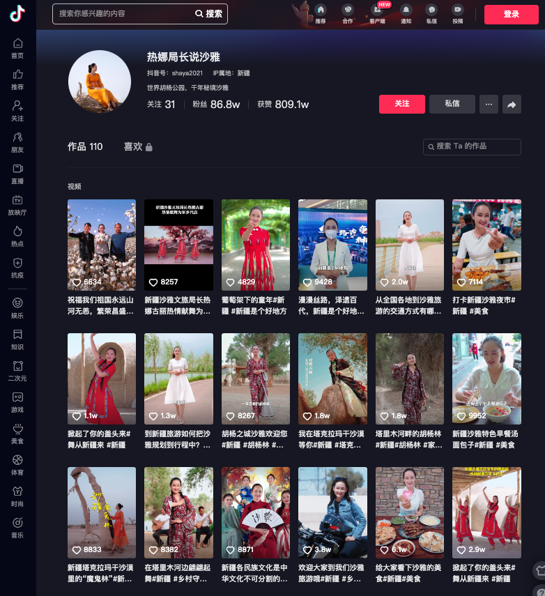 Rahman now has 868k followers on Douyin. Occasionally, Chinese foreign ministry officials tweet out her videos.