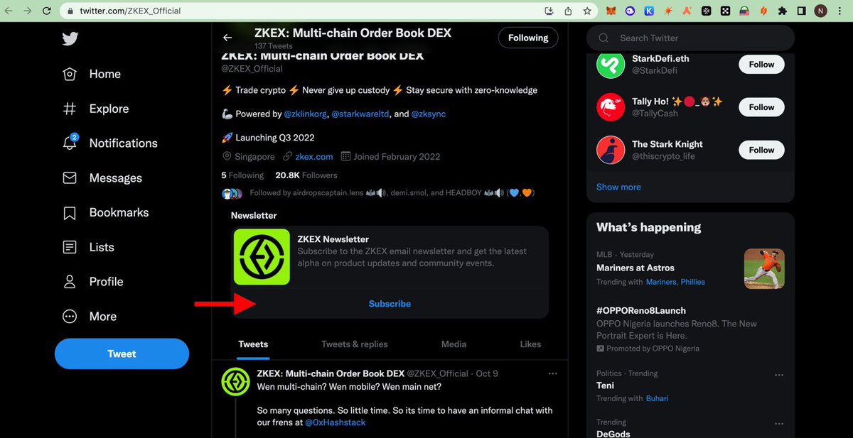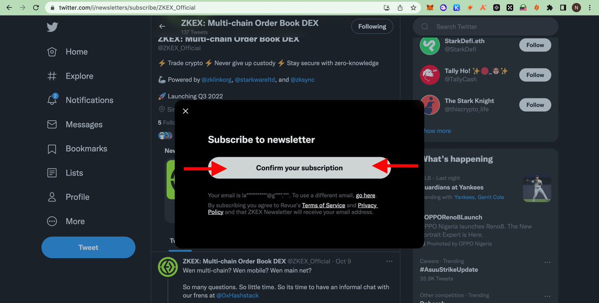 Next We Are Subscribing To @ZKEX_Official Newsletter, Go To Their Profile & Click Subscribe, Then Click Confirm Your Subscription, Be sure of the email link to your twitter as you’d be submitting it.