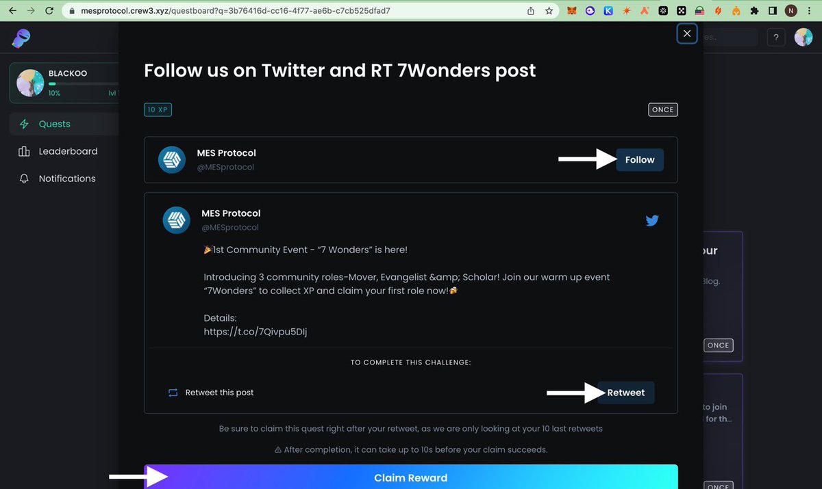 Next Quest, Is To Follower & RT 7Wonders Post, Click ONCE, Then Follow & RT, Next Claim Rewards.