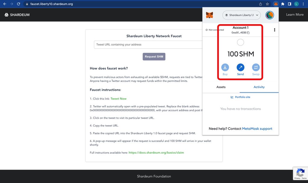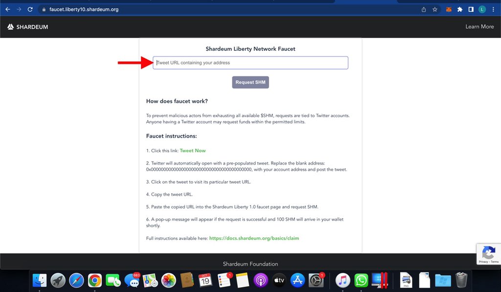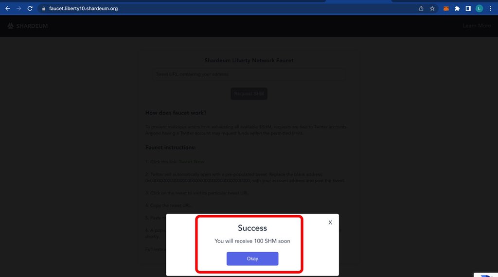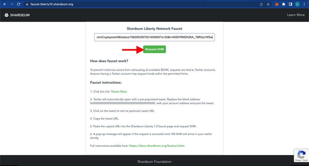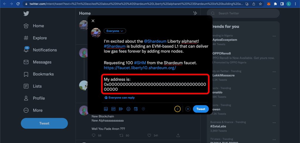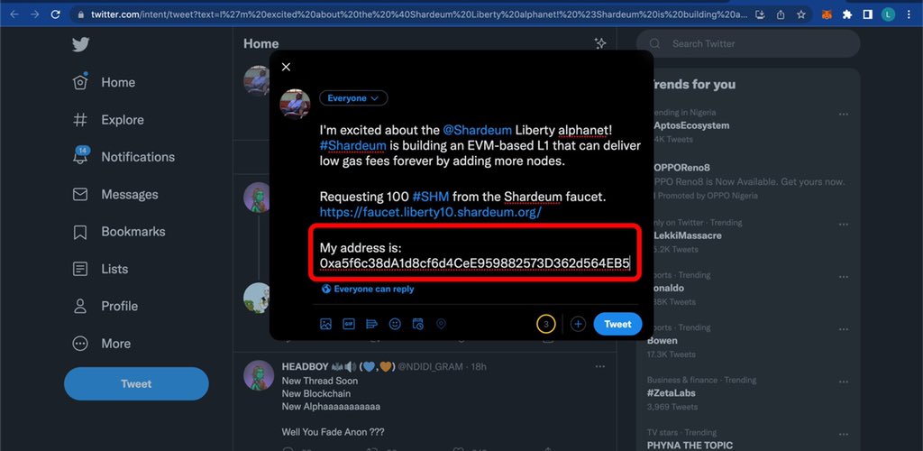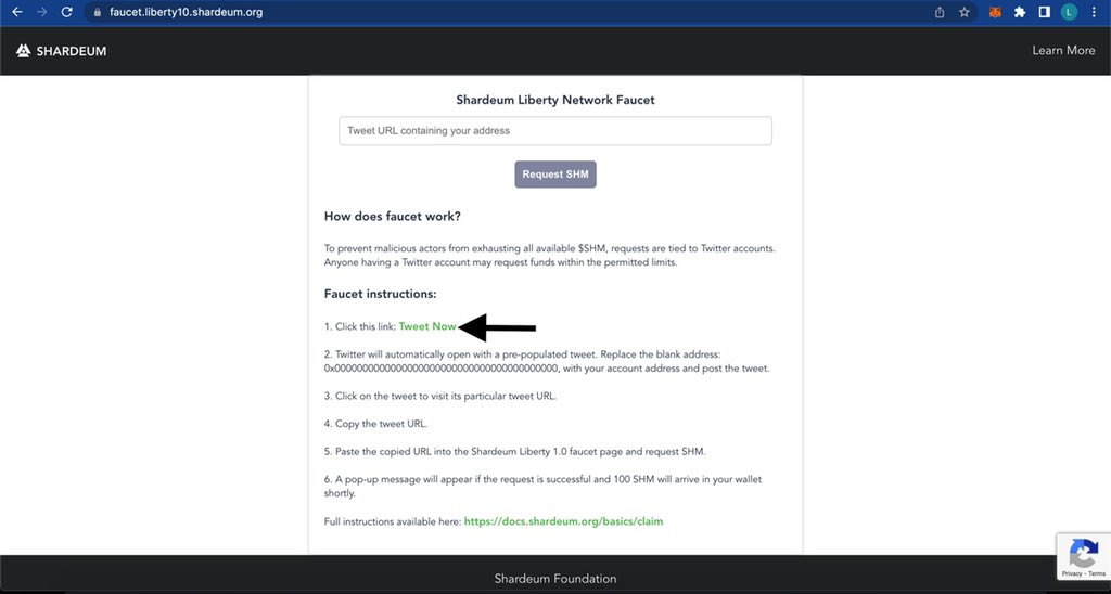 Proceed To Get Some Faucets, Go to faucet.liberty10.shardeum.org, Then Click On “Tweet now” You’d be redirected to twitter, Now Before You Tweet, edit the message & add your wallet address, Now Tweet The Message & Copy The Tweet Link Then Go Back To The Faucet Page