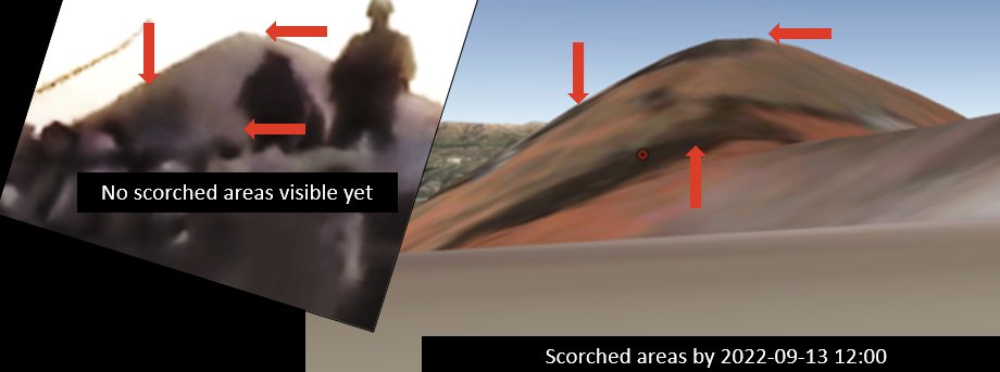 @libe Overlaying Sentinel satellite images on top of Google Earth 3D terrain view, we noticed that scorch marks were already visible on this same hill by September 13 midday. But none of these seem to be on the video, potentially meaning that the incident took place before this time.