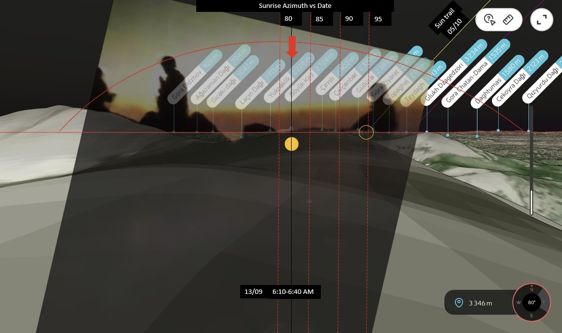 We overlapped this with a matching view extracted from PeakVisor and calibrated azimuth lines across the landscape to determine the position of the sun (80-84 degrees). This sunrise position corresponds to the first two weeks of September according to solar data.