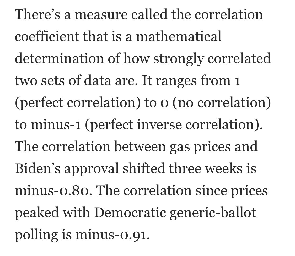 Political scientists need to read this Philip Bump article and explain to him that his math is bad. He examined the relationship between gas prices and polls and found a (ludicrous, false) -0.91 correlation. This idea is seriously affecting the election. washingtonpost.com/politics/2022/…