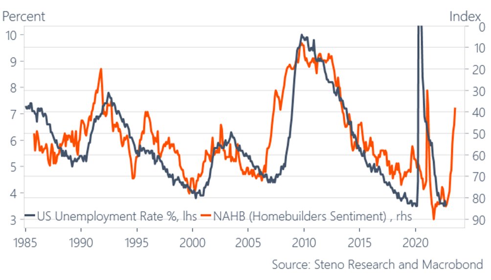 As housing goes, so goes the economy. The NAHB homebuilder’s sentiment is the best gauge of future unemployment (leads 9 months).