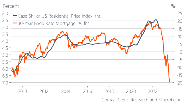 The move in the 30yr mortgage yield is simply unprecedented. The current average level around 7% implies a 20% drawdown in residential prices over the next 9-12 months on historical correlations