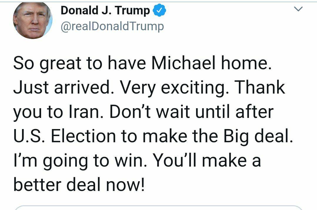 @realdonaltrymp willingness of a big deal with Iran shows its political weight as one of the last chances to achieve something in foreign policy before election. Prisoner swap raised speculations, but for several reasons, the political atmosphere in Tehran resists a big deal 2/