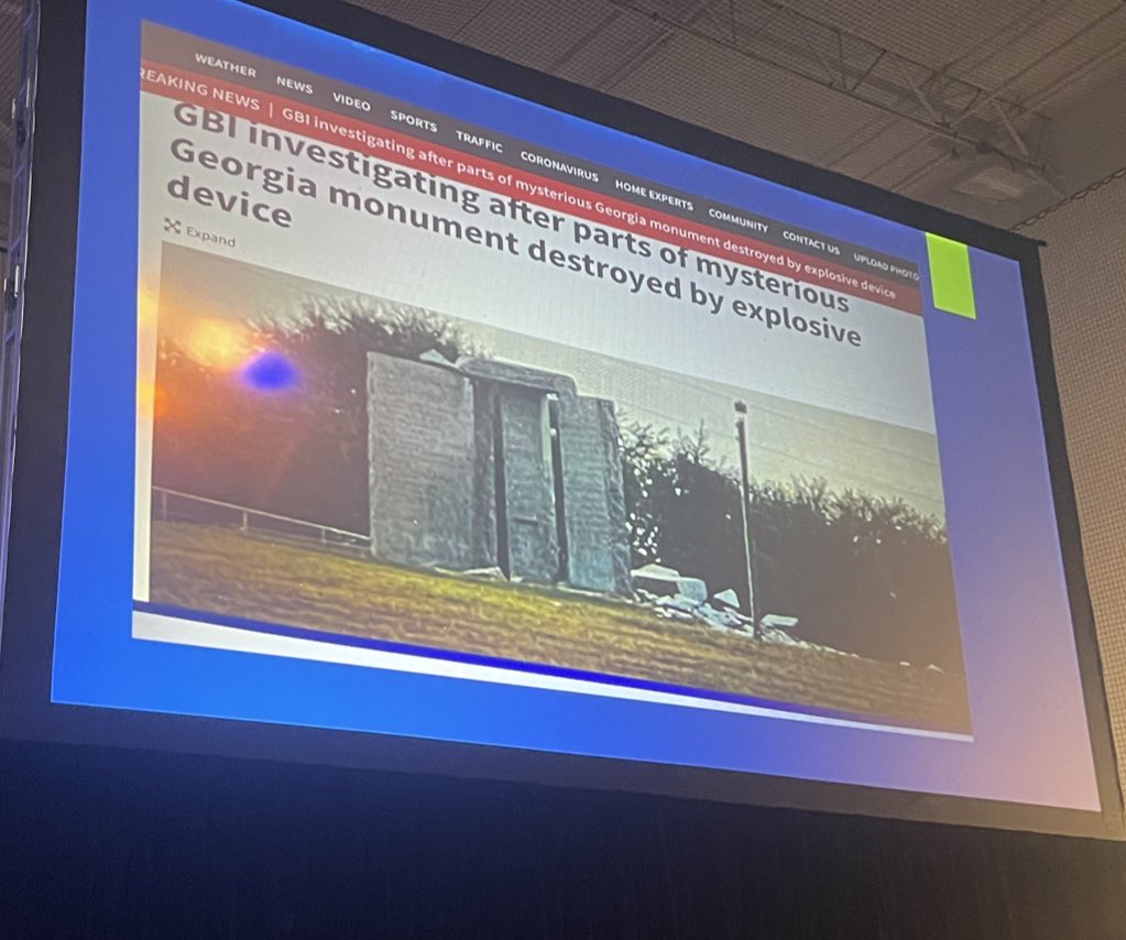 Crowd cheering the bombing of the Georgia Guidestones during a presentation by QAnon conspiracist Sheila Holm